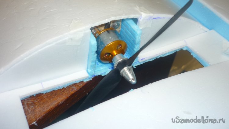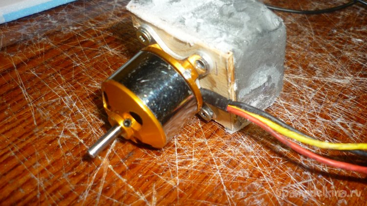 Монтирую кусочек утеплителя с приклеенной 3 мм. фанерой, на которую установил мотор с винтом.