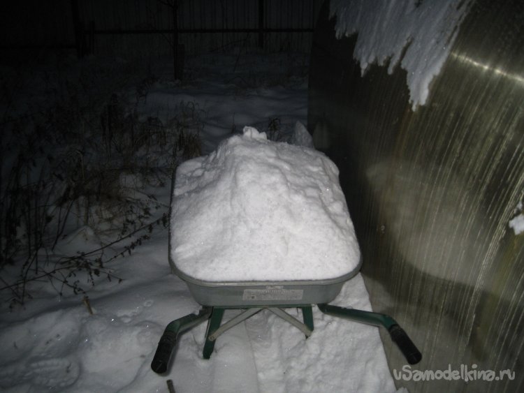 Таким образом, очистив примерно половину одной стороны четырехметровой теплицы, я набрал целую тачку снега (и даже с приличным верхом).