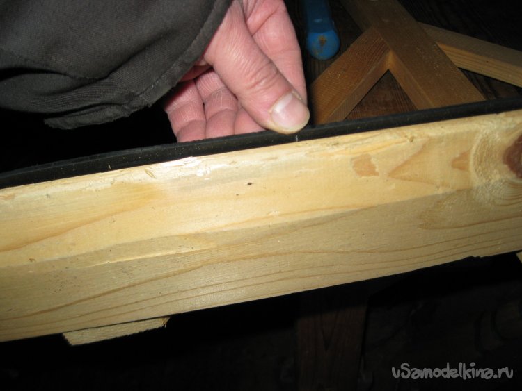 Для того чтобы не повредить поликарбонат теплицы, на рабочей поверхности самого скребка, при помощи шурупов с прессшайбой, закреплена резиновая полоса, которая имеет вылет над кромкой доски примерно в один сантиметр.