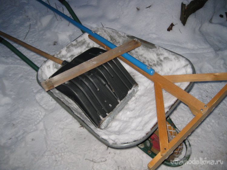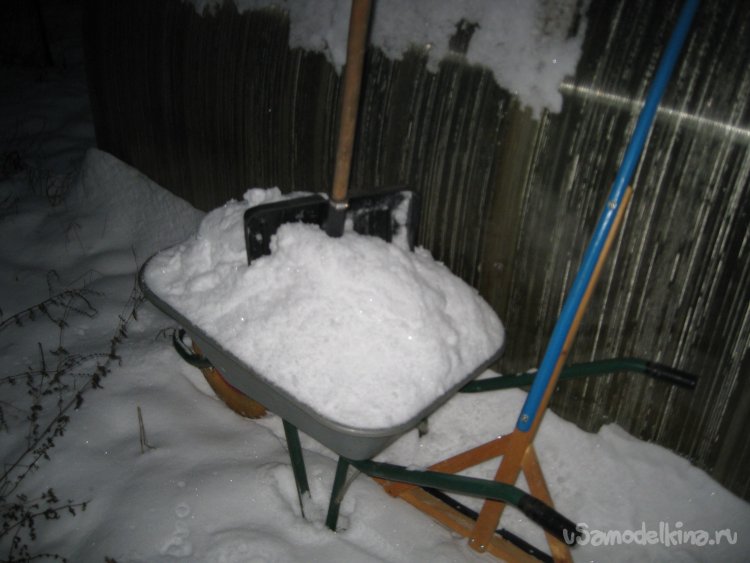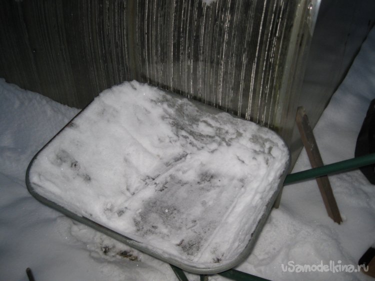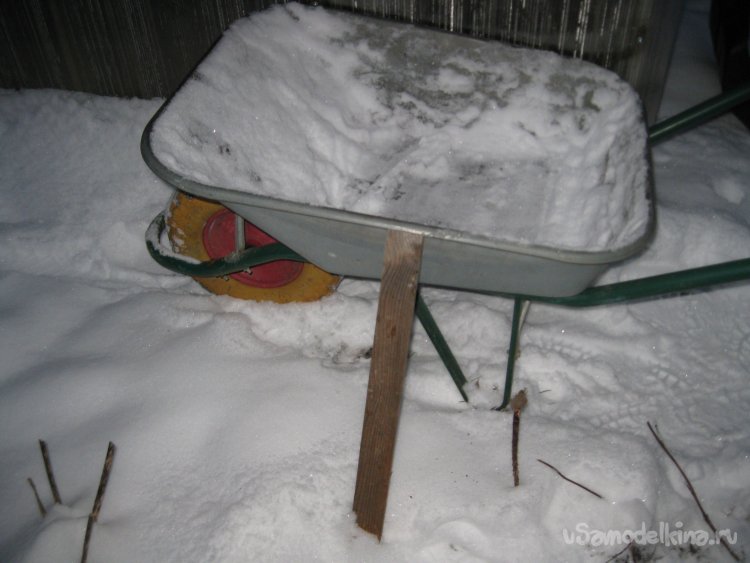 Однако бывает, что тачка не всегда стоит ровно или же между ее бортом и стенкой теплицы имеется щель. При этом снег может просыпаться мимо тачки.