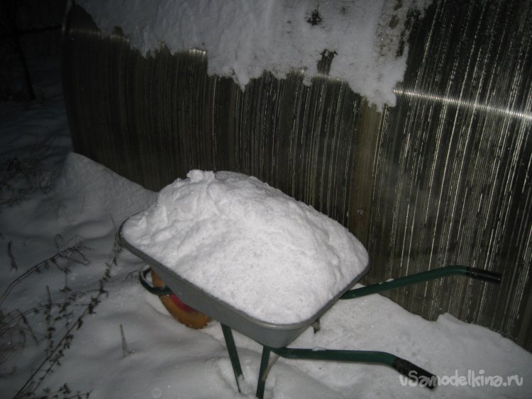 Однако в конце осени – начале зимы, снега бывает еще очень мало и возникает вопрос: где его взять? Так вот, ответ очевиден – взять этот снег, можно счистив его с теплицы. Забегая вперед, скажу, что по моему опыту, только с одной арочной теплицы из поликарбоната длиной шесть метров, можно набрать от четырех до шести садовых тачек снега, причем, зачастую, с приличным верхом.