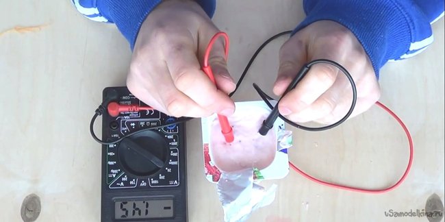 Теперь проверим при помощи тестера, сколько же вольт даёт один йогурт. Выставляем тестер на 20 В, опускаем клеммы в клубничный йогурт и смотрим на результат. Тестер показывает 1.44 - 1.45 В, но значение немного скачет.