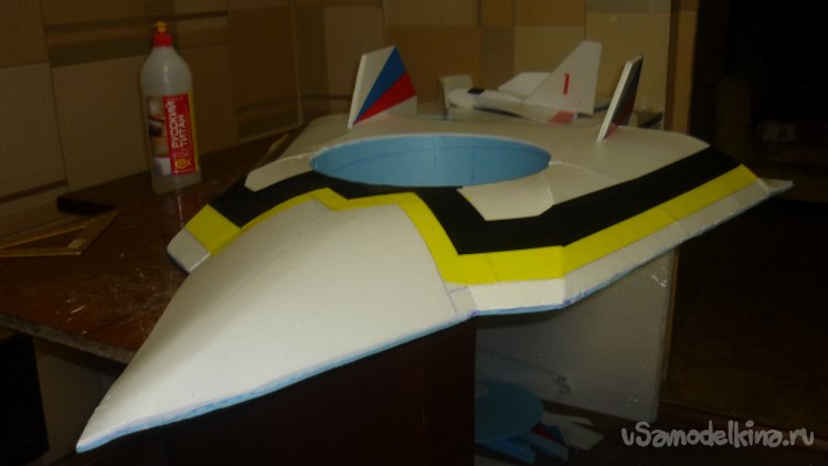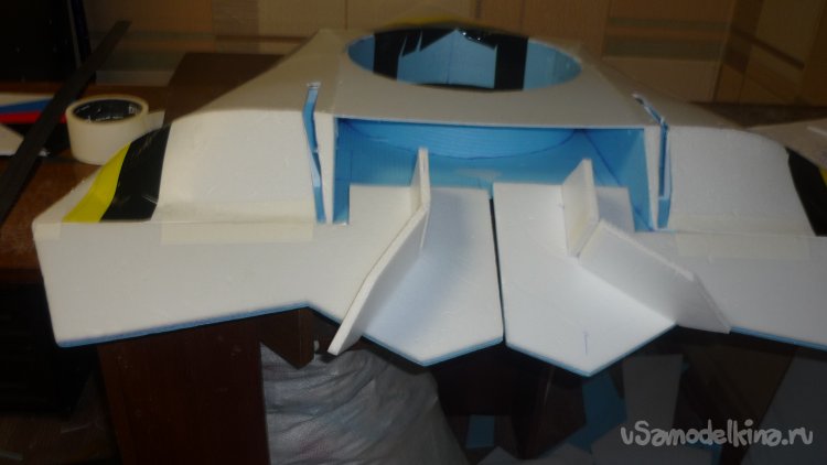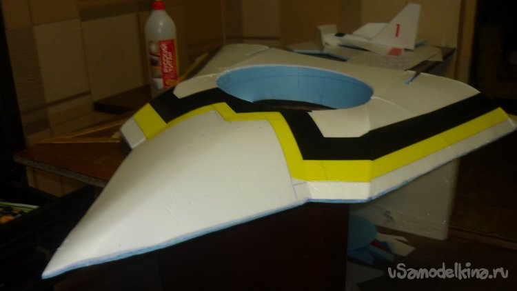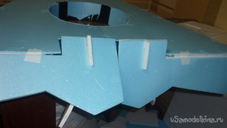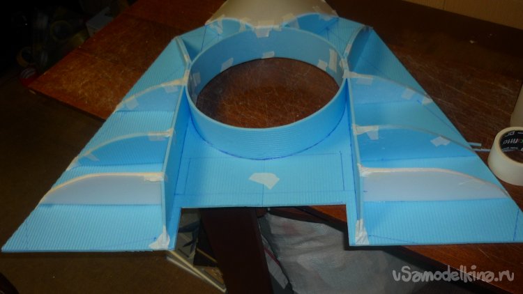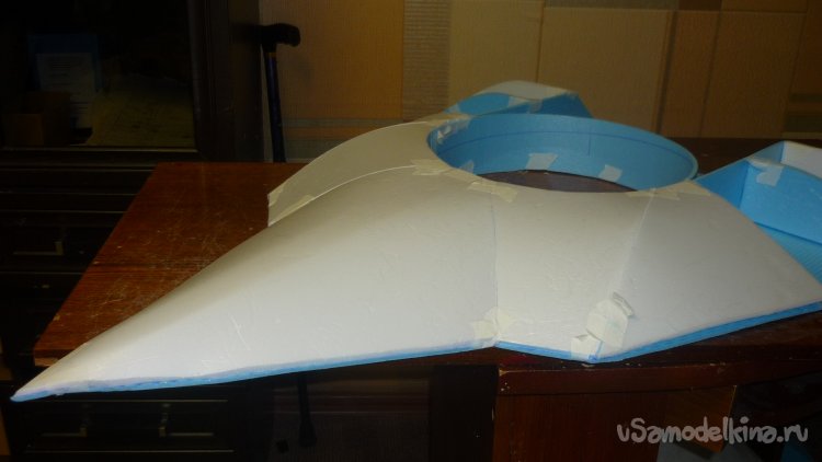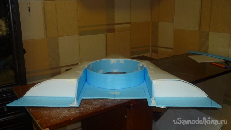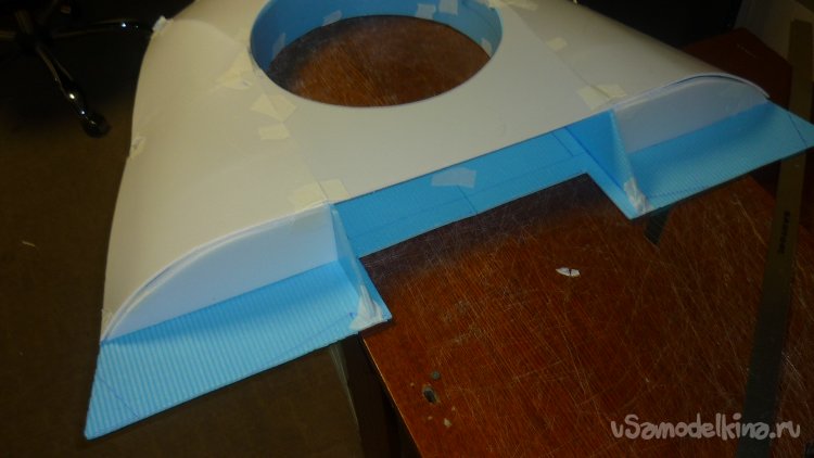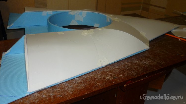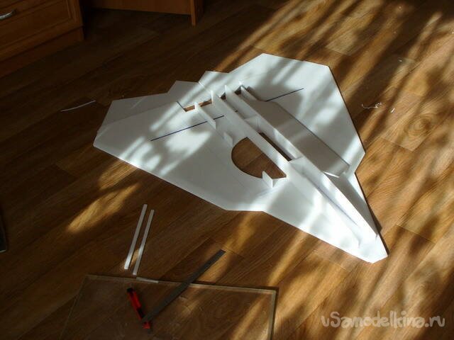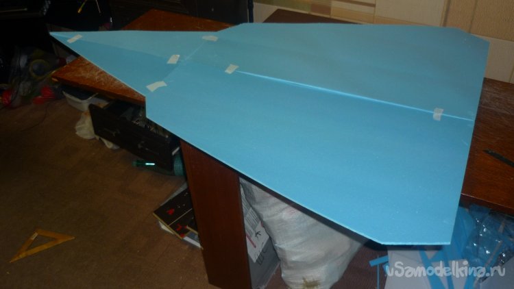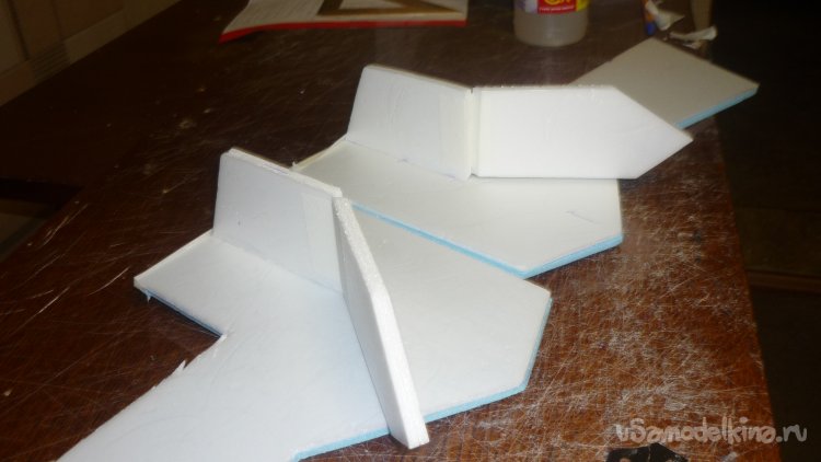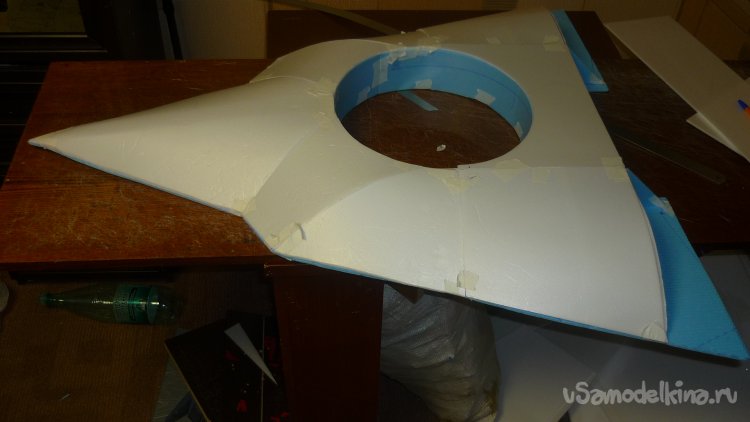 Вклеил каждую секцию на место. Получилась очень необычная конструкция, которая сочетает в себе широкий фюзеляж, переходящий в крыло.