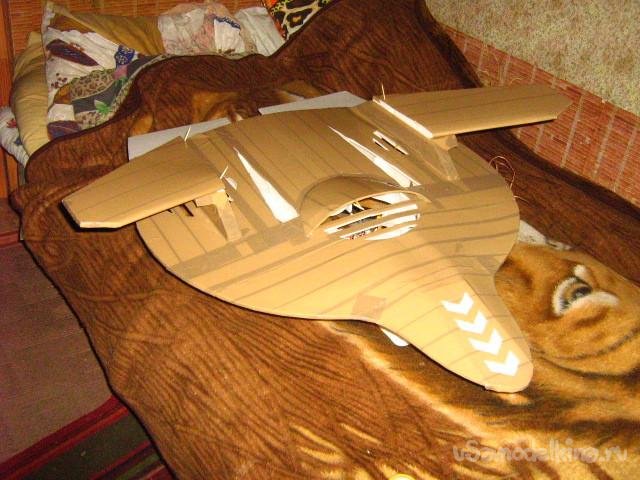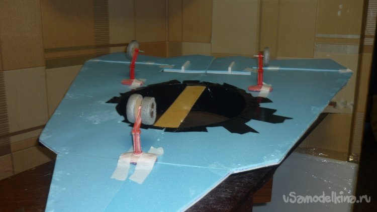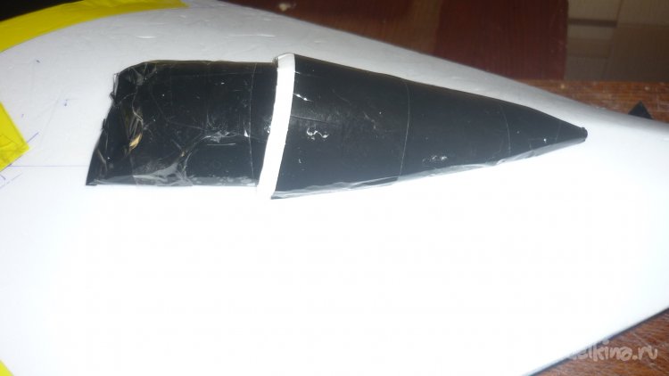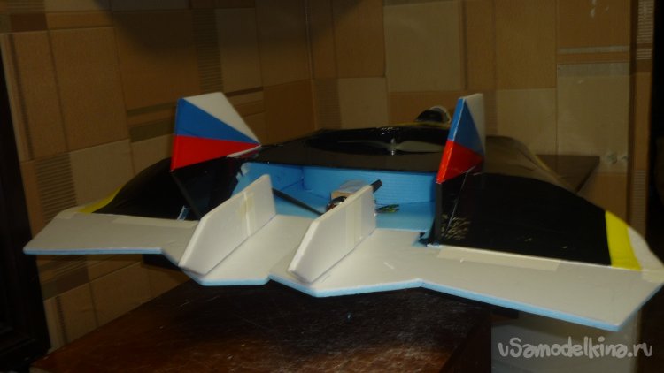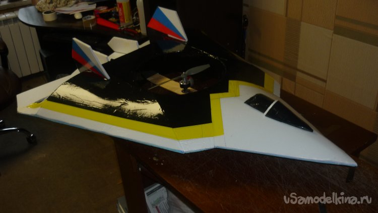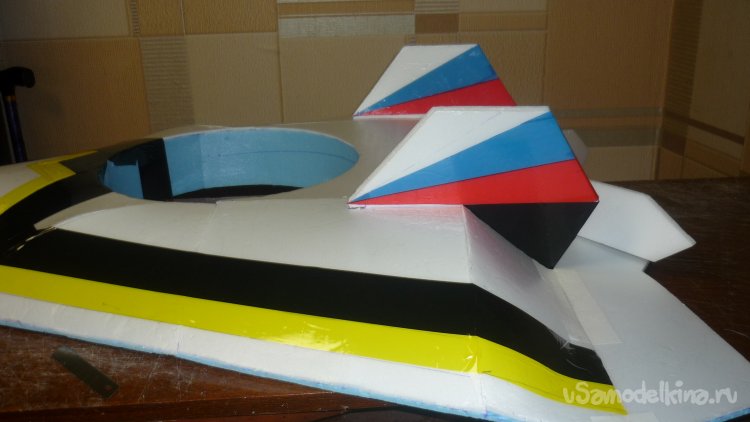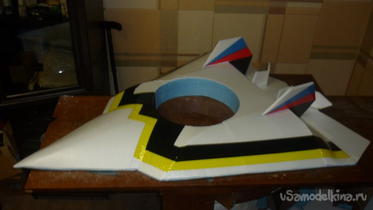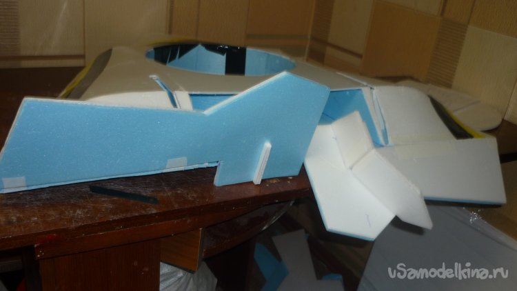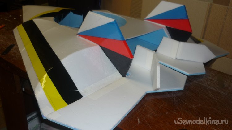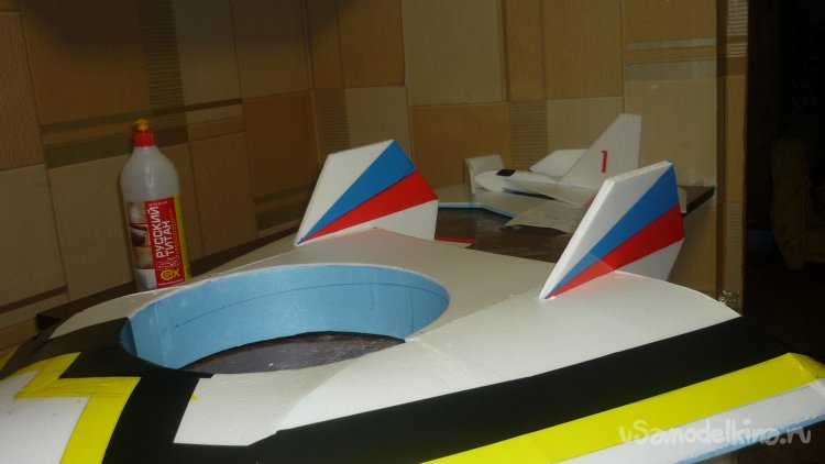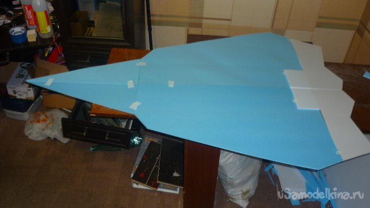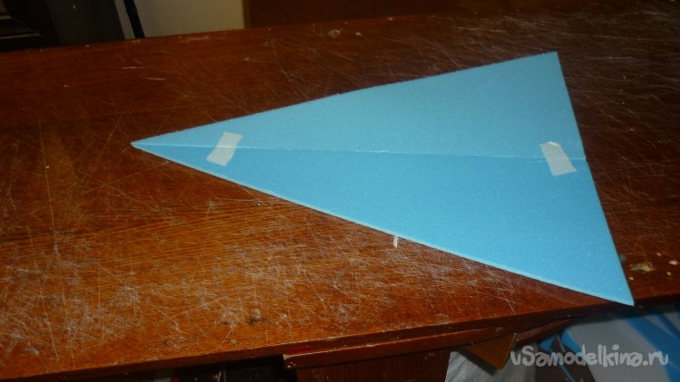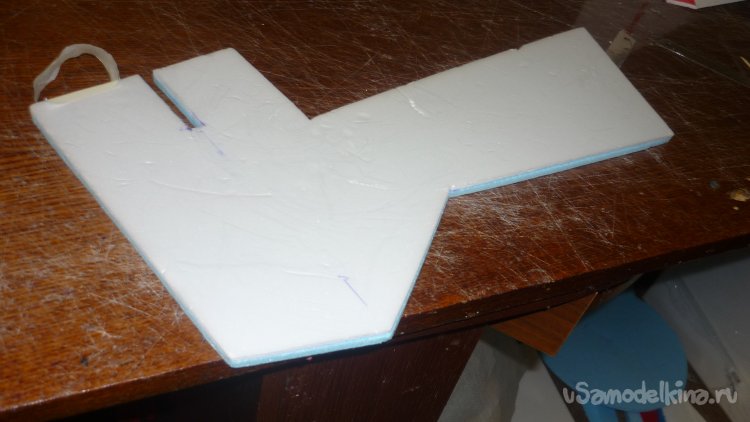 Вклеил каждую секцию на место. Получилась очень необычная конструкция, которая сочетает в себе широкий фюзеляж, переходящий в крыло.