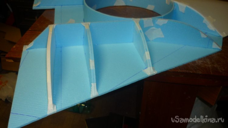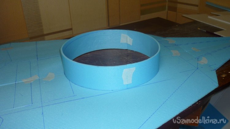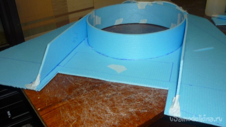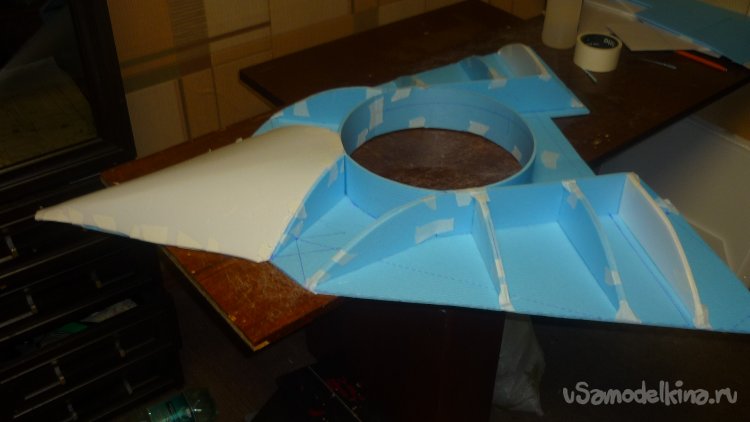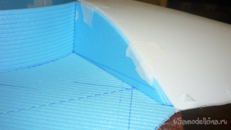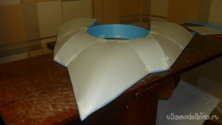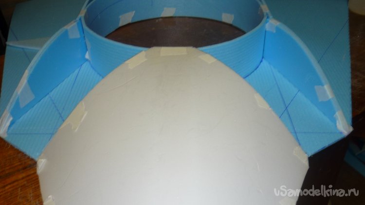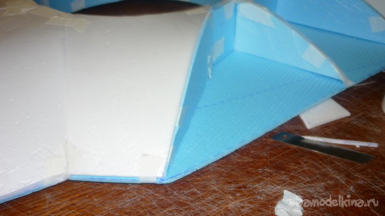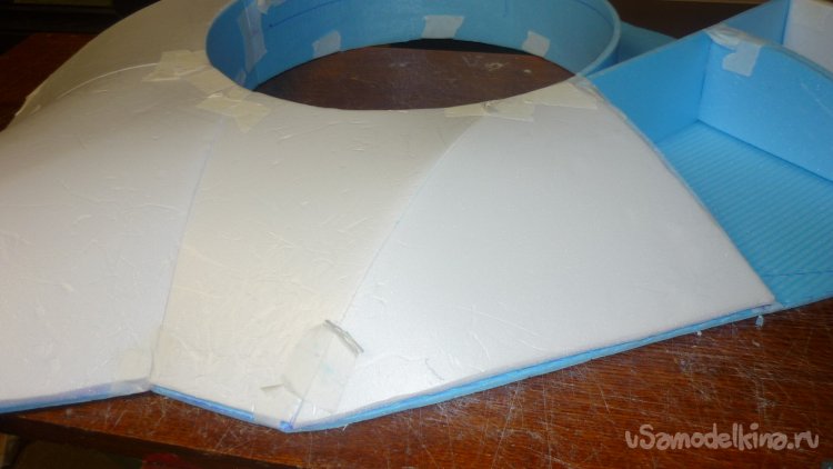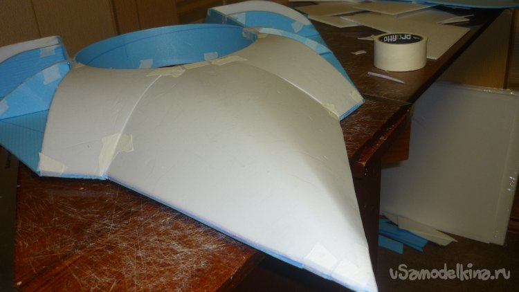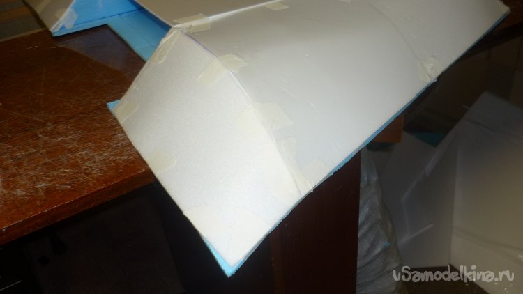 Выкраиваю, примеряю и подгоняю по месту каждую секцию внешней обшивки модели. Закрепляю каждую секцию кусочками бумажного, малярного скотча.