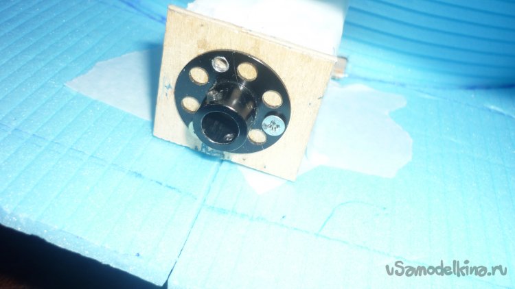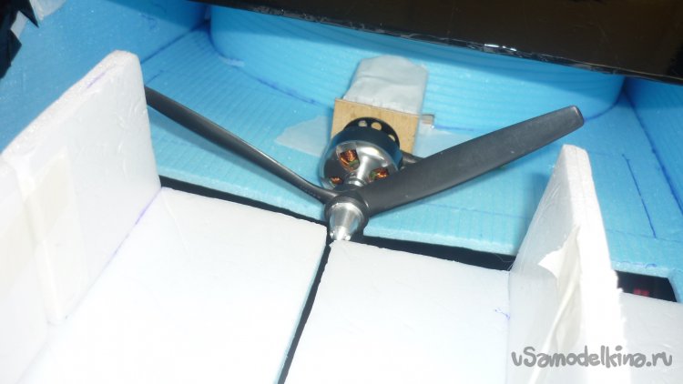 Вклеиваю кусочек утеплителя, с приклеенной 3 мм. фанерой и установленным основанием для мотора в хвостовой части модели.