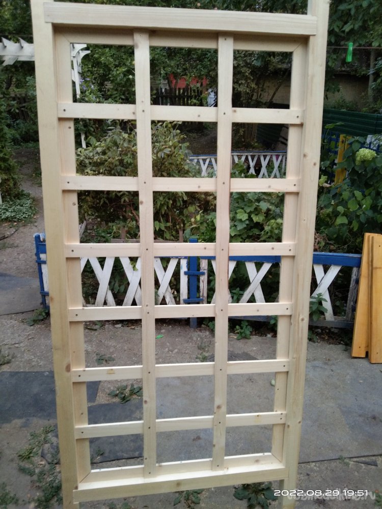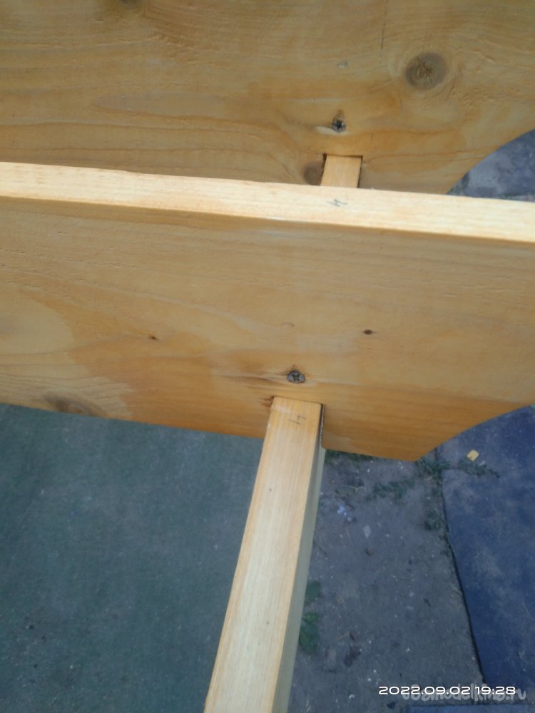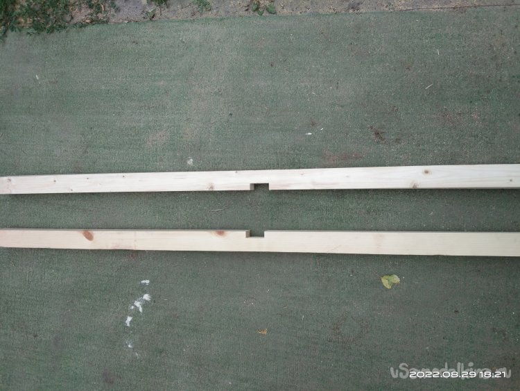 Приступаю к работе. С помощью торцовочной пилы отрезаю заготовки нужной мне длины. Затем, сверяюсь с "техническим заданием" - листком на котором клиент сделал зарисовку того, что он хочет получить в конечном итоге и размеры. На отпиленных брусьях вычерчиваю разметку для пазов, в которые будут устанавливаться поперечные крепления, соединяющие две детали в одну конструкцию. Брусья я использовал размером 50*60 мм. Той же торцовкой делаю пропилы, установив диск на глубину 15 мм. Глубже их делать нет никакой необходимости. Сшибаю ненужное молотком, а нижнюю часть пазов выравниваю стамеской. На каждом брусе по два таких паза. Их делал с таким учетом, чтобы поперечные брусья входили в них впритык. Разложив все заготовки на горизонтальной поверхности и обильно промазав клеем каждый паз, с помощью деревянной киянки вгоняю поперечные брусья в пазы. Далее, через обратную сторону пазов шуруповертом высверливаю по несколько отверстий в брусья. Семидесятыми саморезами стягиваю детали. Получается крепкое и надежное соединение. Далее во внутреннем пространстве стенок, между двумя поперечными распорками, необходимо сделать рамку. Для этого я использую бруски размерами 40*10 мм. Вымеряю расстояние и по этим размерам напиливаю заготовки. Концы спиливаю под углом в 45 градусов. Данные заготовки креплю к основным брусьям с помощью клея и гвоздей. Заранее высверлив отверстия в планке рамки для гвоздей, вставляю их туда таким образом, чтобы вылезли только кончики. Далее наношу клей и забиваю. Таким образом очень удобно работать, т.к. в самой планке уже есть крепеж, и его не приходится забивать когда на деталь нанесен клей. Т.е. заготовка не "елозит" во кремя крепления и не размазывает клеевой слой. К данной рамке я начинаю устанавливать обрешетку. Она сделана из того же бруса что и сама рамка - 40*10 мм. Начинаю с крепления перпендикулярных брусьев. Они крепятся саморезами к станкам рамки. Продольные же устанавливаются поверх поперечных, крепятся к ним же на пересечениях планок. Обрешетку покрываю биотонером. Цвет - сосна. Второй рамкой я закрываю обрешетку, так что шляпки саморезов на рамке становятся невидимы. Тут произошла небольшая неприятность. По некоторым причинам мне пришлось на некоторое время остановить рабочий процесс. Когда же я к нему приступил снова, то увидел, что на одной стороне планки рамок заметно так повело. Появились зазоры и щели. Снимать рамку полностью я посчитал нецелесообразным. Поэтому что получилось поправил вручную, а для остального пришлось использовать клеевую шпатлевку по дереву. Она не только закрывает зазоры, но и клеит детали. К тому же она имеет цвет дерева. Поэтому нанес на все нужные места шпатлевку, закрыв ею изъяны. После высыхания орбитальной шлифовальной машиной выровнял все плоскости. Забегая вперед скажу, что после того, как пергола была полностью готова, покрыта биотонером и за ней приехал заказчик, я указал ему на места нанесения шпатлевки. Как он выразился - если бы я не показал ему, то он и не обратил бы на это ни какого внимания. Но тут уж я руководствовался своими принципами. Лучше покажу сам, даже если внешне дефект и не заметен, чем его впоследствии обнаружит заказчик и начнет качать права. Стенки перголы готовы.