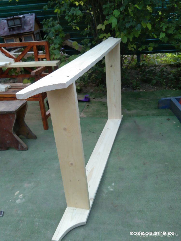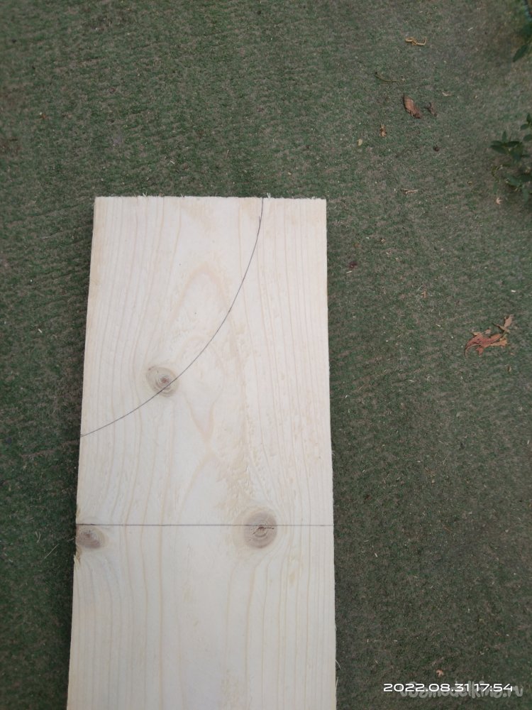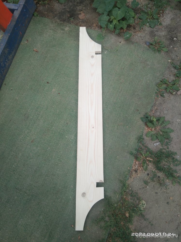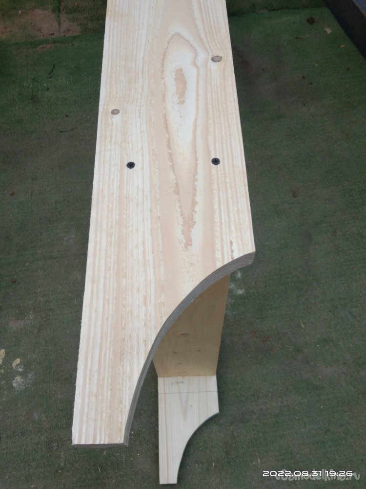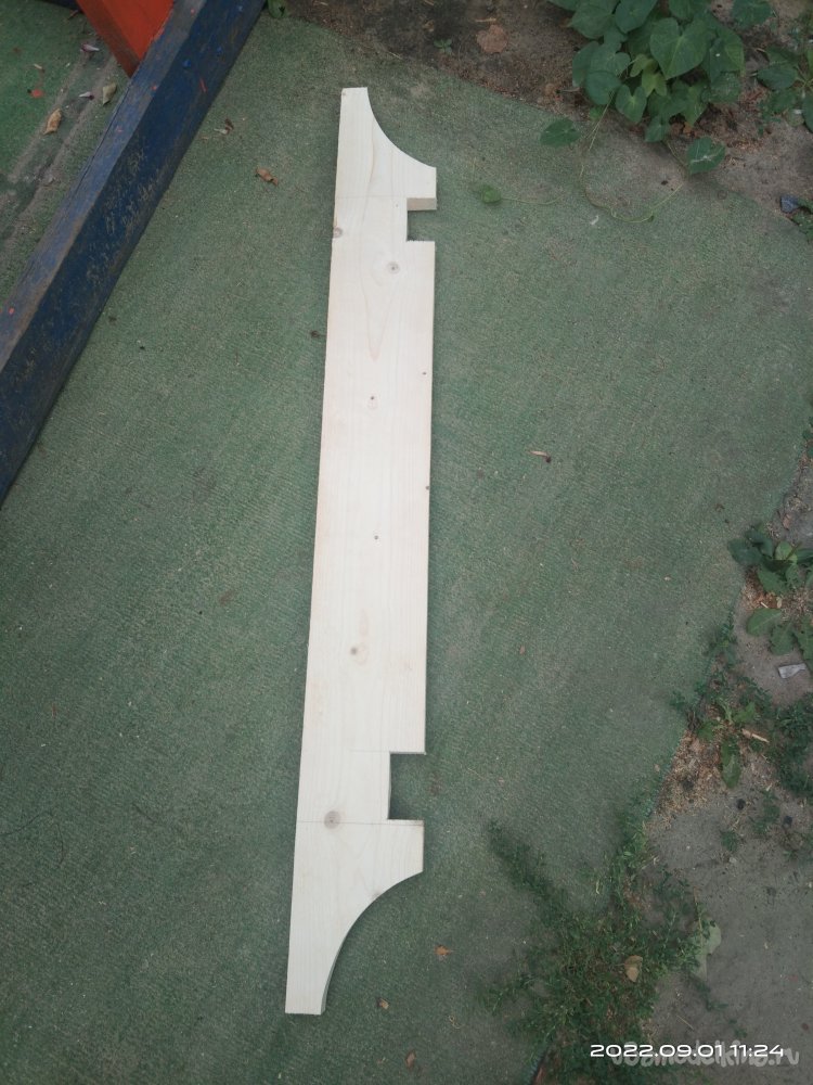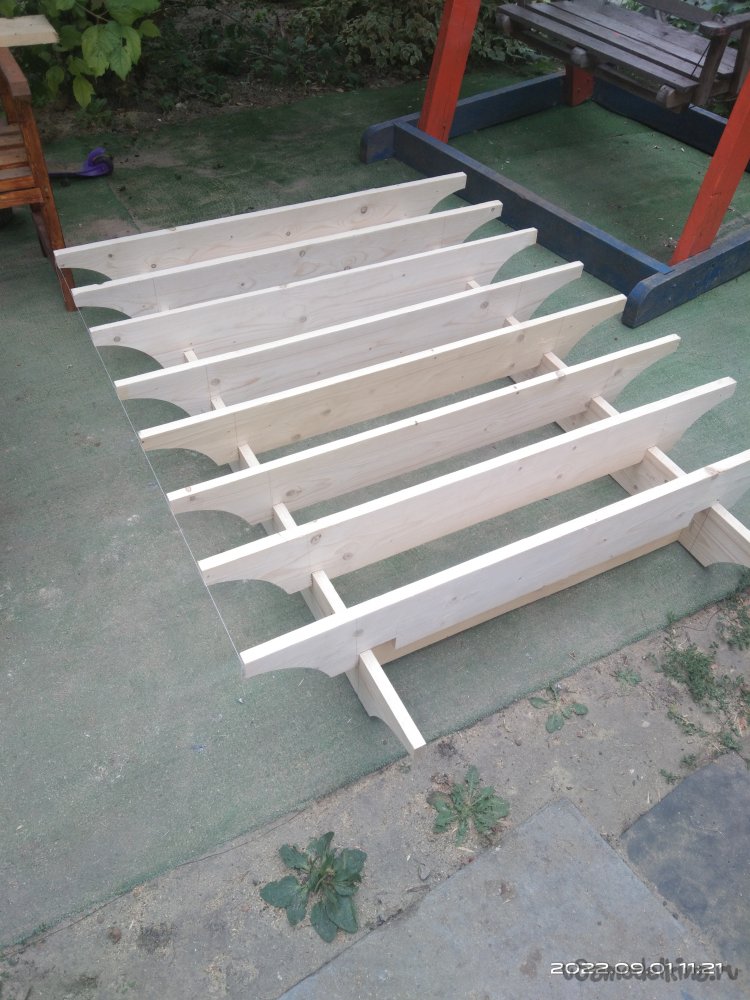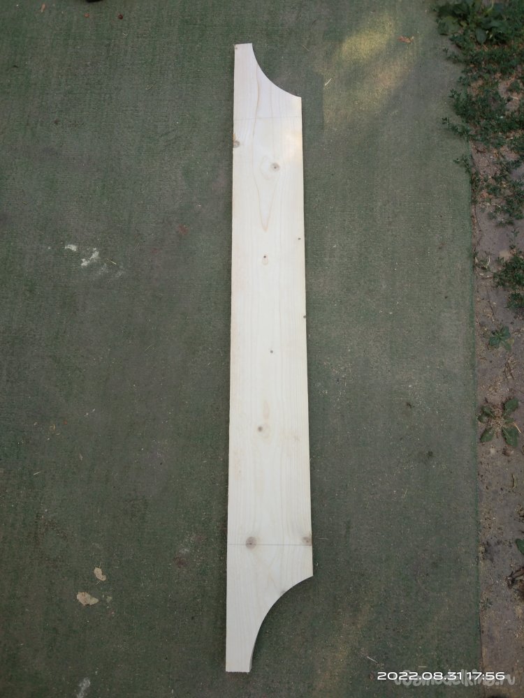 Теперь необходимо собрать крышку перголы. Она будет изготавливаться из досок размером 25*150 миллиметров. Так как доски были куплены не обработанными, то необходимо привести их в порядок. Отпилив их по необходимой длине тщательно их отшлифовал. Для этого была задействована УШМ с лепестковым диском и шлифовальная машинка. На циркулярной пиле отпилил их до размера 120 мм, так как именно такой размер хочет заказчик. Так же он указал что края досок необходимо сделать под скругленным углом. Чтобы не заморачиваться и не вырисовывать разметку вручную на каждой доске, я из подручных материалов сделал трафарет, прикладывая который к заготовкам, обводил и уже по данной зарисовке оппиливал электрическим лобзиком. Спилы хорошенько зачистил наждачной бумагой. Для крыши необходимо 10 таких деталей. Две основные из которых будут соединять между собой стенки перголы, они длиннее, а оставшиеся 8 штук будут установлены на верху всей конструкции. Собираю прямоугольную основу крышки. Пилю две заготовки равные по длине ширине стенок. Саморезами соединяю основные заготовки с этими. Получается прямоугольник - основа будущей верхушки. Затем раскладываю на ней оставшиеся детали. Отмечаю места их крепления к основным доскам. Так же намечаю места пазов. Пазы по размерам равны толщине досок на которые они будут установлены. За исключением двух крайних, там пазы будут немного больше для того, чтобы в них могли зайти концы брусьев стенок. К ним же, через болтовое соединение и будет крепиться вся верхушка перголы. Когда все пазы сделаны, устанавливаю крайние доски и саморезами наискосок намертво закрепляю их к основе. Между ними натягиваю нитку, так сказать для перестраховки. Да и с ее помощью будет очень удобно выравнивать все остальные детали. Хоть доски с пазами и должны быть все на одном уровне, но лучше уж немного подстраховать себя, чтобы не было неприятных сюрпризов. После выравнивания все детали закрепляю на основе крышки. Данное изделие покрываю биотонером. Вот что получилось: