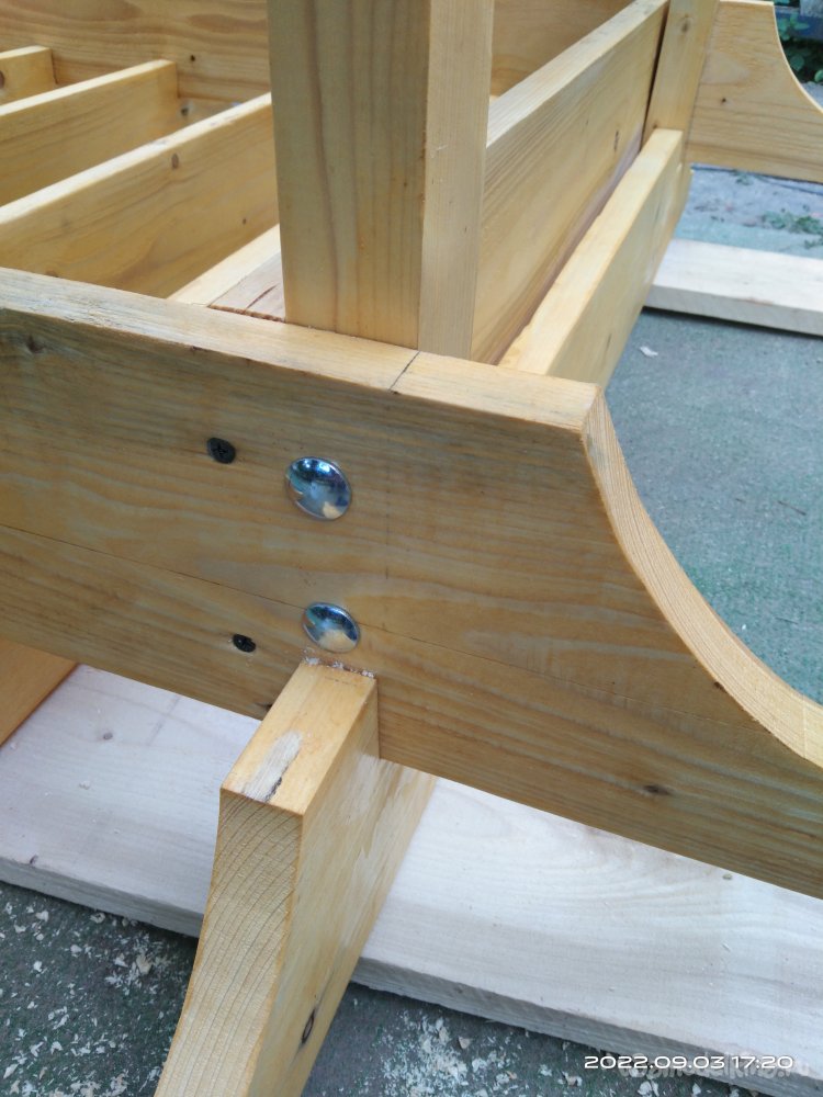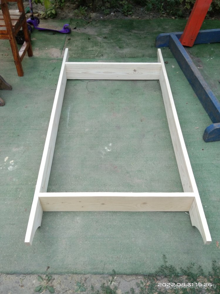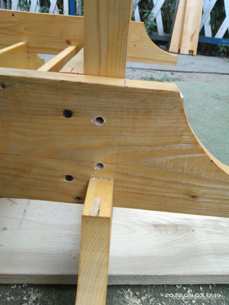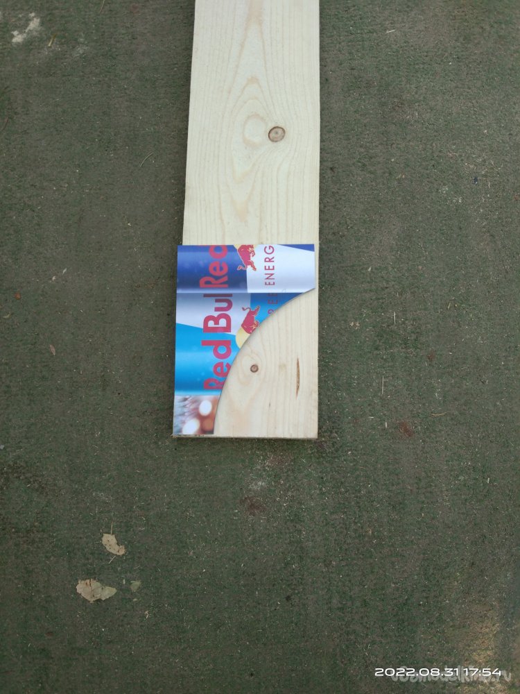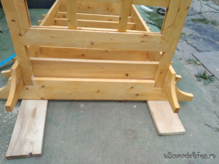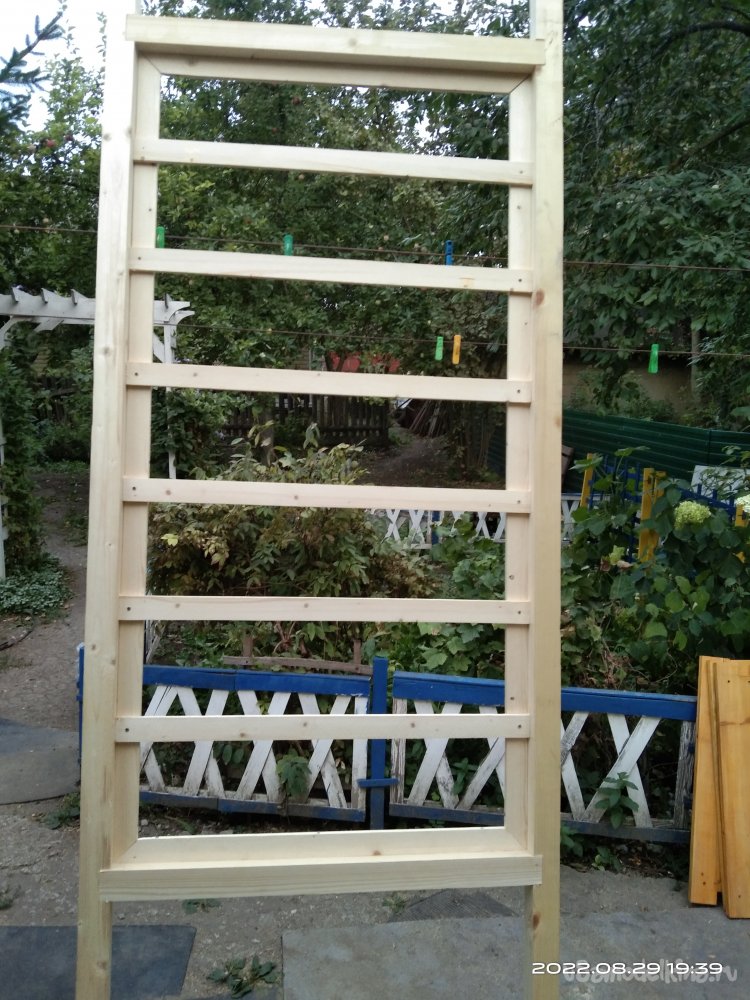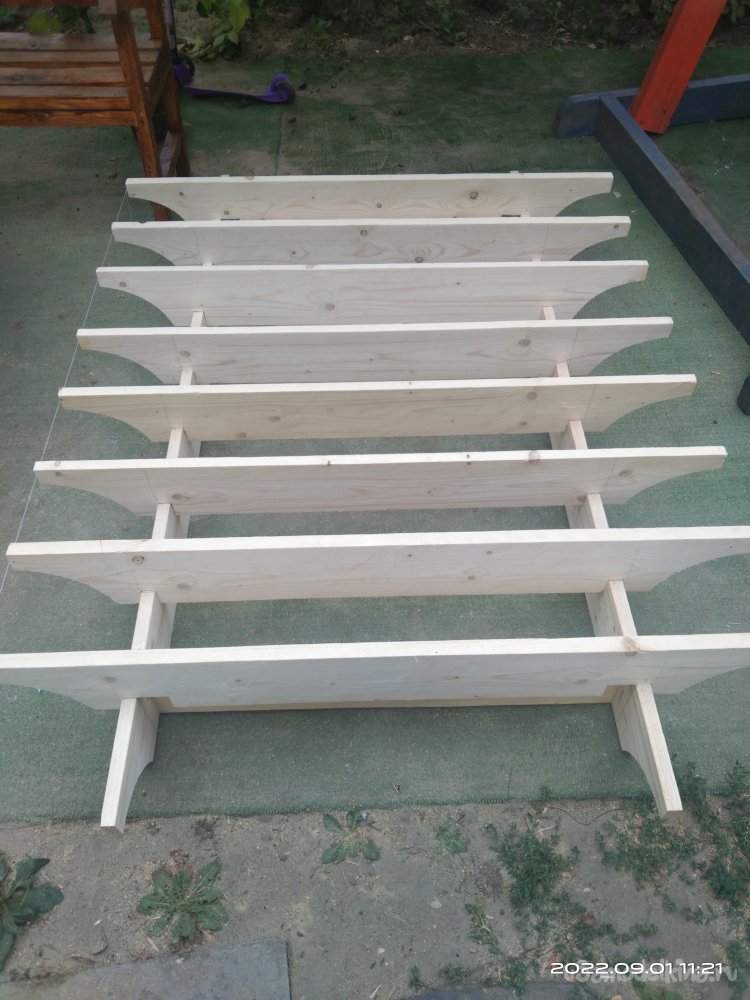 Теперь необходимо собрать крышку перголы. Она будет изготавливаться из досок размером 25*150 миллиметров. Так как доски были куплены не обработанными, то необходимо привести их в порядок. Отпилив их по необходимой длине тщательно их отшлифовал. Для этого была задействована УШМ с лепестковым диском и шлифовальная машинка. На циркулярной пиле отпилил их до размера 120 мм, так как именно такой размер хочет заказчик. Так же он указал что края досок необходимо сделать под скругленным углом. Чтобы не заморачиваться и не вырисовывать разметку вручную на каждой доске, я из подручных материалов сделал трафарет, прикладывая который к заготовкам, обводил и уже по данной зарисовке оппиливал электрическим лобзиком. Спилы хорошенько зачистил наждачной бумагой. Для крыши необходимо 10 таких деталей. Две основные из которых будут соединять между собой стенки перголы, они длиннее, а оставшиеся 8 штук будут установлены на верху всей конструкции. Собираю прямоугольную основу крышки. Пилю две заготовки равные по длине ширине стенок. Саморезами соединяю основные заготовки с этими. Получается прямоугольник - основа будущей верхушки. Затем раскладываю на ней оставшиеся детали. Отмечаю места их крепления к основным доскам. Так же намечаю места пазов. Пазы по размерам равны толщине досок на которые они будут установлены. За исключением двух крайних, там пазы будут немного больше для того, чтобы в них могли зайти концы брусьев стенок. К ним же, через болтовое соединение и будет крепиться вся верхушка перголы. Когда все пазы сделаны, устанавливаю крайние доски и саморезами наискосок намертво закрепляю их к основе. Между ними натягиваю нитку, так сказать для перестраховки. Да и с ее помощью будет очень удобно выравнивать все остальные детали. Хоть доски с пазами и должны быть все на одном уровне, но лучше уж немного подстраховать себя, чтобы не было неприятных сюрпризов. После выравнивания все детали закрепляю на основе крышки. Данное изделие покрываю биотонером. Вот что получилось: