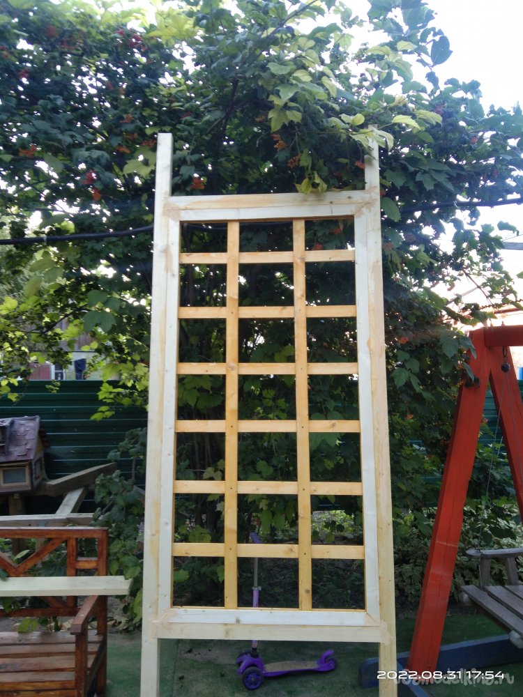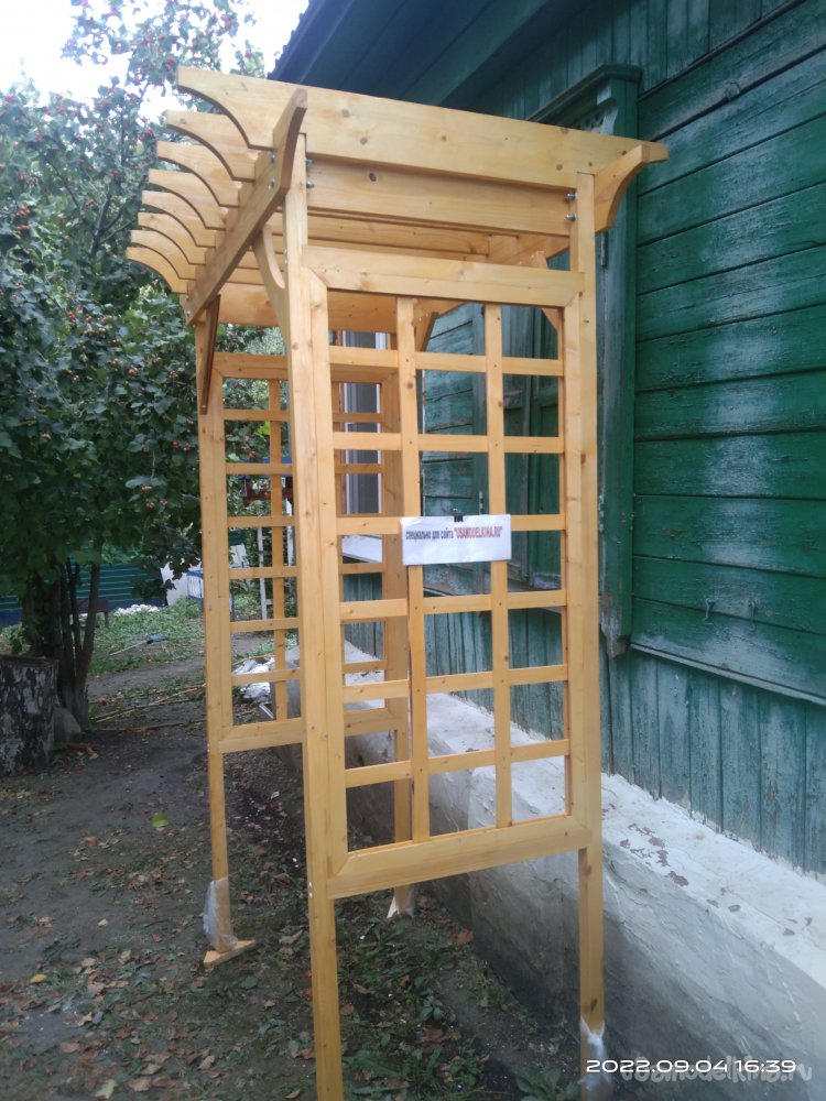 Здравствуйте уважаемые мастера и любители сделать что-либо своими руками. В данной статье я хочу вам наглядно показать и дать подробное, пошаговое описание того, как я изготавливал перголу. Данная конструкция может стать как и зеленым козырьком над входной дверью, опорой для разнообразных вьющихся растений, так и полноценной зоной отдыха в любое время. Перголы популярны не только у нас, в России-матушке, но и за границей. Например в английских садах ставят небольшие, компактные деревянные перголы, а в восточных садах они больше похожи на отдельное строение, напоминающее элитную беседку, чем простой навес для растений. Так же, как следует из истории, перголы строили еще во времена расцвета Римской империи. Но тогда они выполняли сугубо прагматическую роль - они поддерживали виноградную лозу для того, чтобы кисти винограда не лежали на земле. Если можно верить такому интернет-ресурсу как википедии, то данное слово произошло от итальянского слова «pergola» и латинского «pergula» — что означает навес или пристройка. Данное значение актуально и по сей день. В настоящее время пергола представляет собой обычный деревянный решетчатый навес, чаще всего в форме квадрата, или же полукруга. Вот и я хочу написать о том как делал под заказ такое же сооружение. Сразу покажу готовый результат, а вы уже сами решите смотреть вам дальше статью или не стоит.