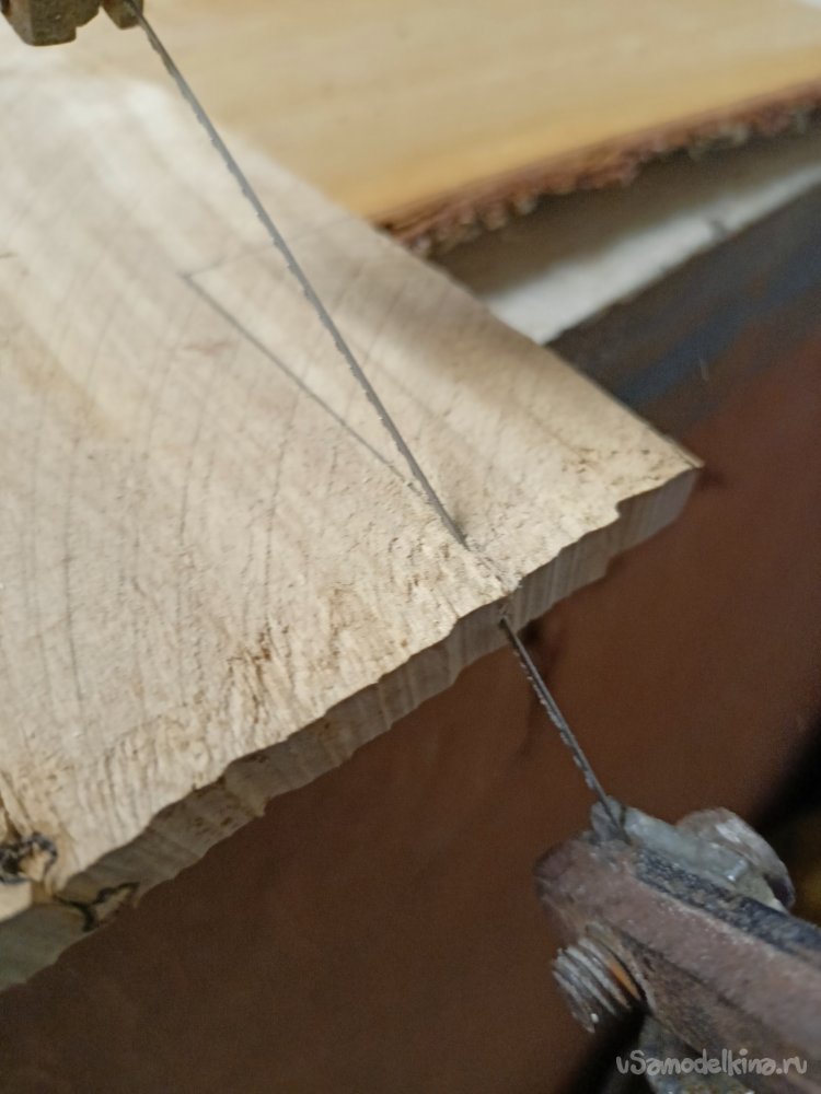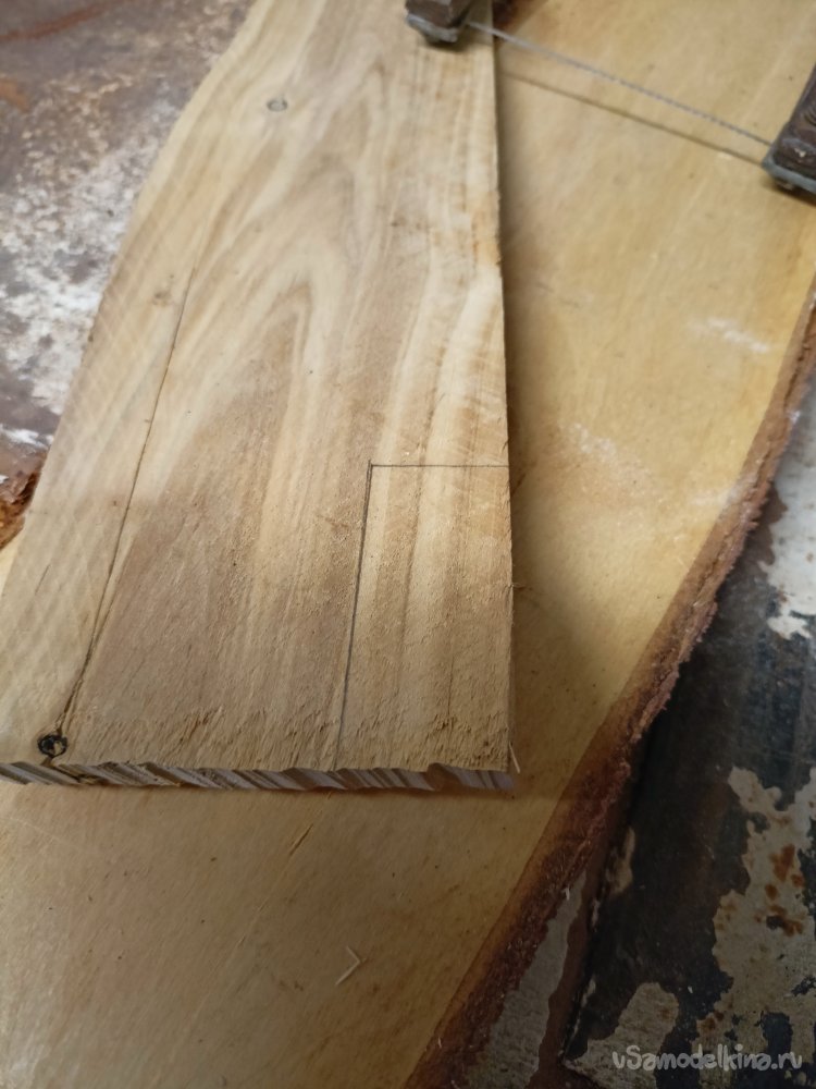 25. Решил для придания интересной формы и рисунка пропилить наискосок заготовку( для этого ранее был сделан запас.) Наносим разметку. (главное не отпилить лишнего)