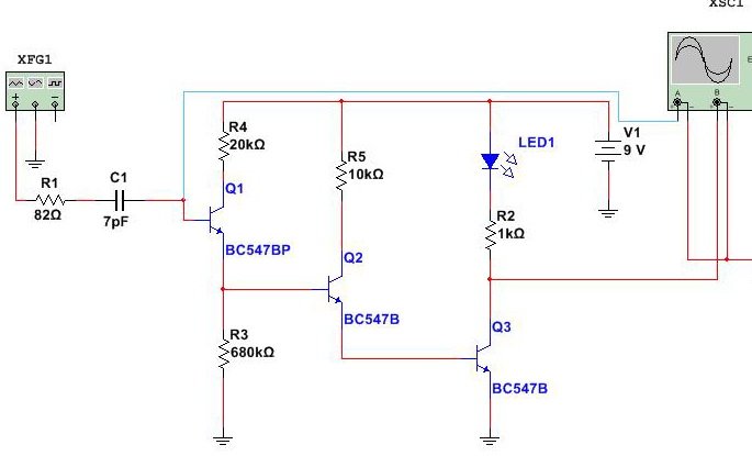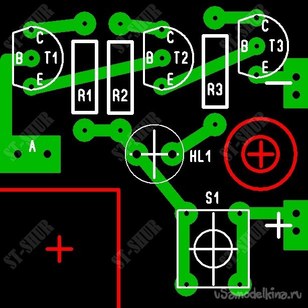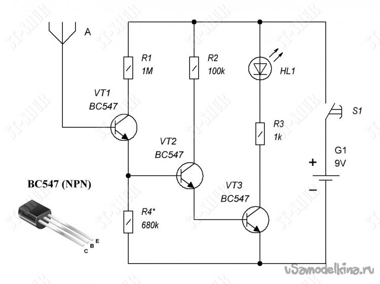 Поскольку в наличии не было подходящего «полевичка», была выбрана простейшая схемка на биполярниках (имевшихся под рукой). Звуковую «пищалку» пока добавлять не стал, т.к. на данный момент хватает световой индикации.
