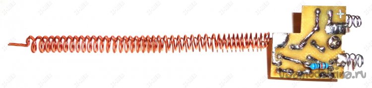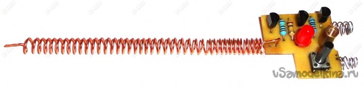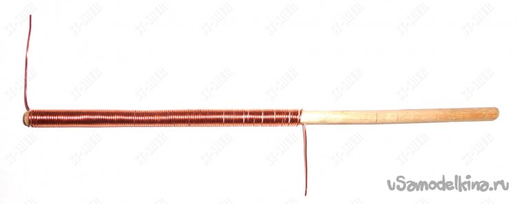 В ходе предварительных экспериментов пробовались разные варианты поисковых антенн. В результате остановился на варианте, в виде пружинки намотанной на круглый деревянный профиль диаметром 4,5мм медным поводом диаметром 0,65мм. После небольшого растяжения получившейся «пружинки» было оставлено 40 витков провода.