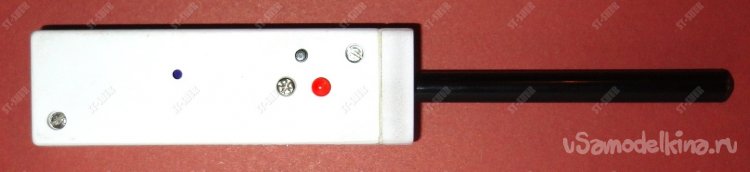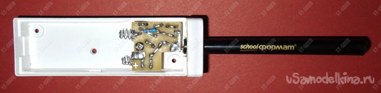 В качестве защитной гильзы для антенны использован обрезок корпуса фломастера длинной 93мм внешним диаметром 8,5мм, который достаточно плотно вставляется в наклеенный на корпус кусочек пластика.