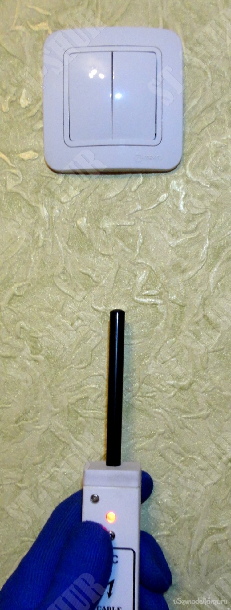 В результате получился вполне работоспособный приборчик, который обнаруживает в стене электропроводку, находящуюся под напряжением 220В на расстоянии до 5-10см (в зависимости от наличия рядом расположенной арматуры и прочих факторов). Точность локализации кабеля (по крайне мере для моих нужд) получилась вполне приемлемой.