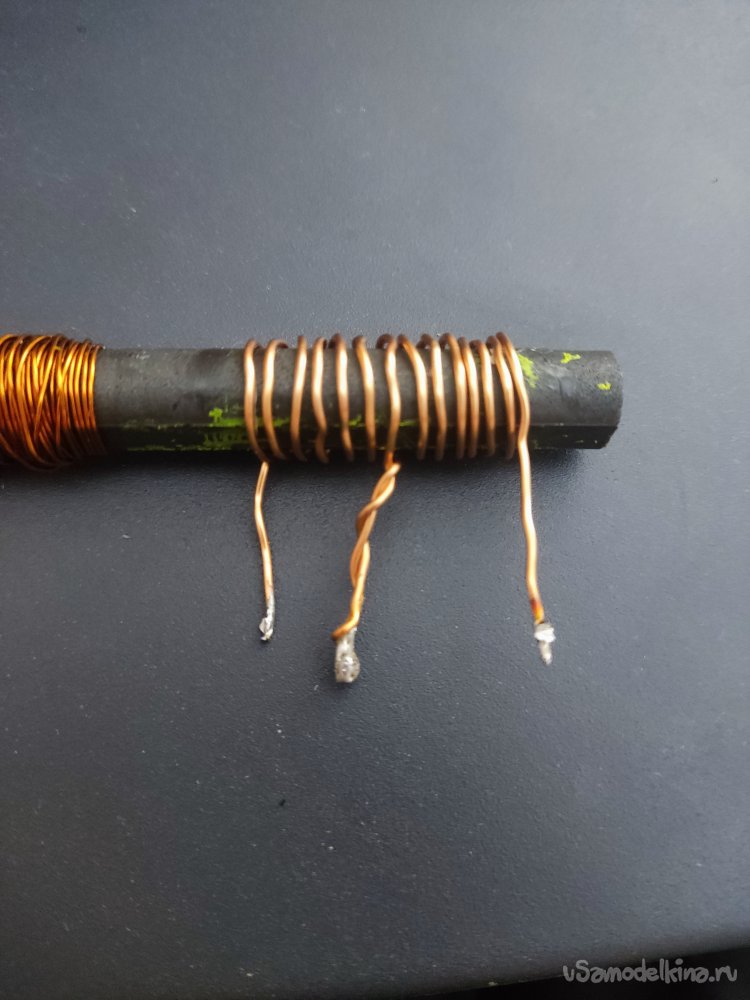 Теперь нам нужно намотать первичную обмотку, я намотал 12 витков с отводом от середины, но лучше намотать 30 витков, тоже с отводом от середины