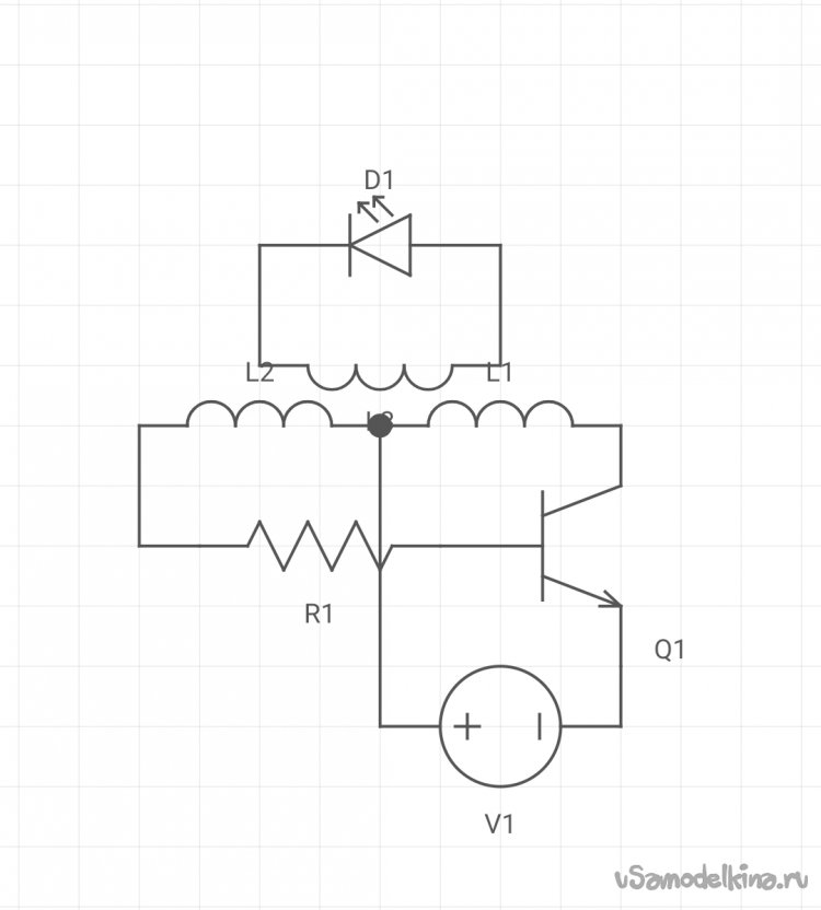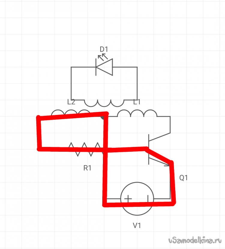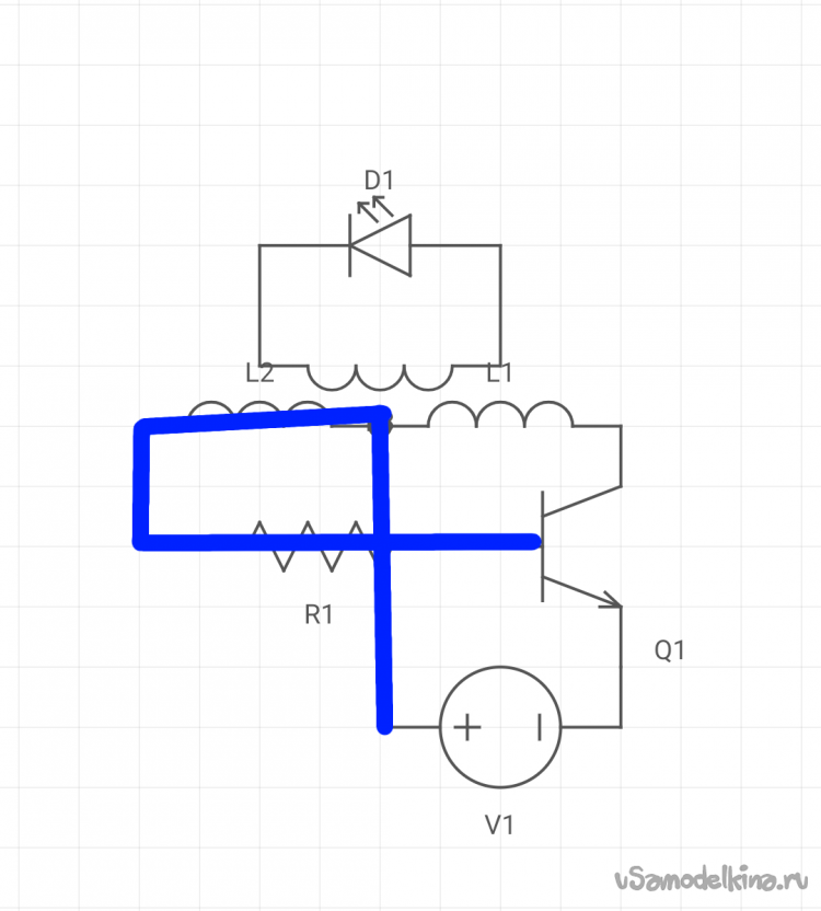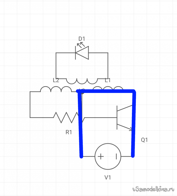 Когда мы подаем питание, транзистор закрыт, и ток идёт к базе транзистора, это так сказать начальный импульс, он нужен для запуска схемы