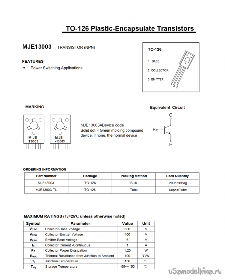 На оставшийся вывод резистора припаиваем базу транзистора, для этого нам нужно узнать распиновку транзистора MJE13003