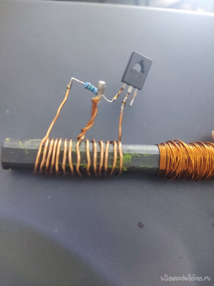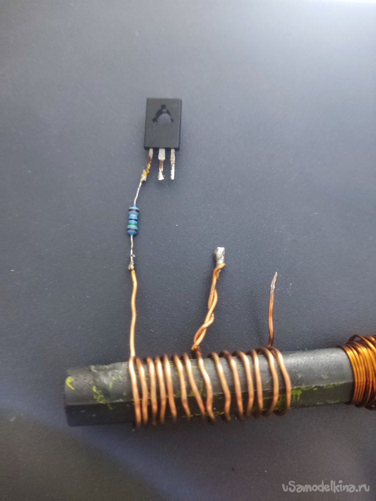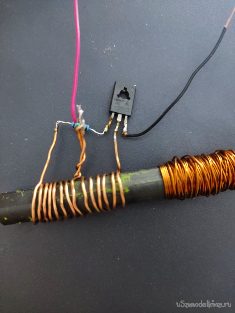 Следующим шагом нам нужно припаять оставшийся крайний вывод первичной обмотки на коллектор транзистора, в моём случае это средний вывод