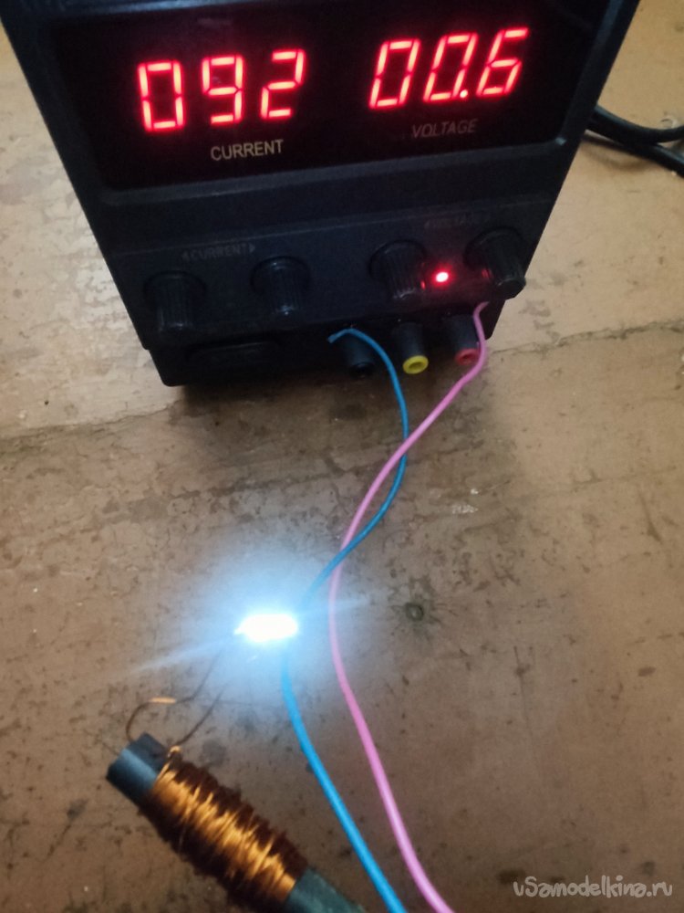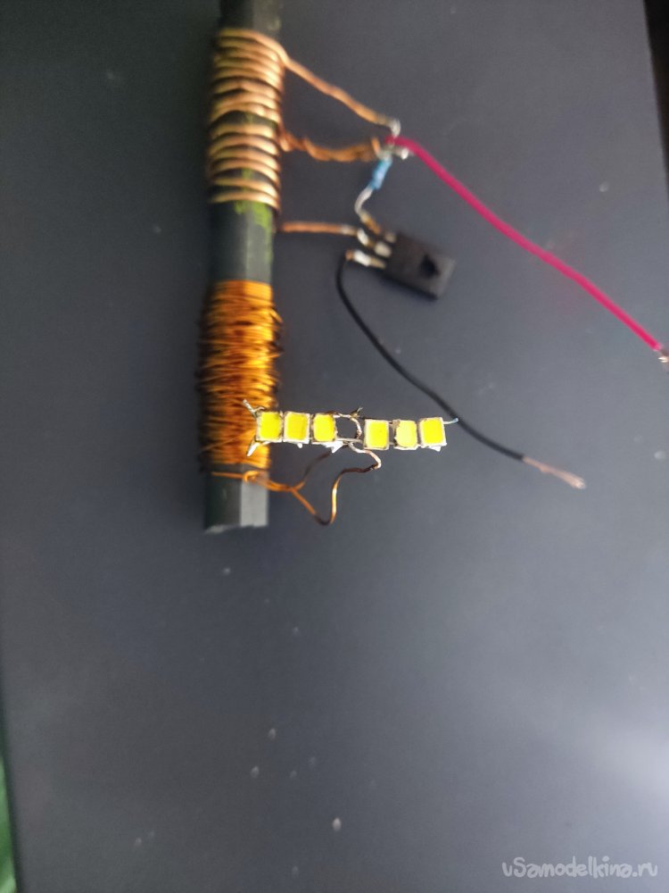 Выходом преобразователя будет вторичная обмотка, на неё я припаял параллельно соединенные светодиоды