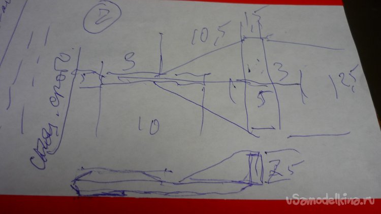 Прикинул, какой размер модели самый оптимальный для моего тира, что бы можно было использовать модели не только в закрытом помещении, но и на улице и начал вычерчивать прямо на потолочке нужные детали конструкции модели.