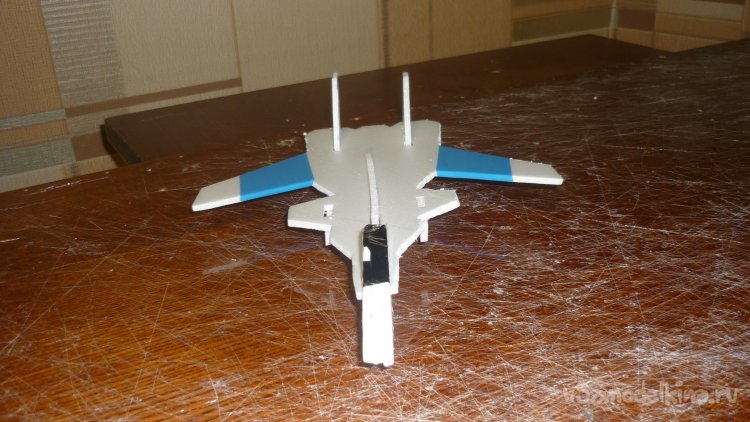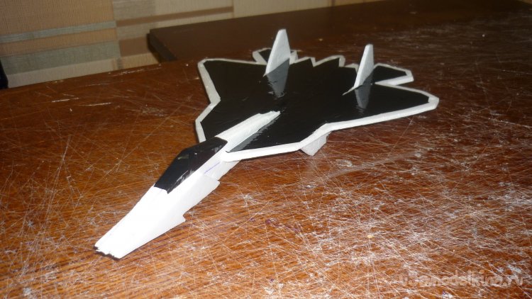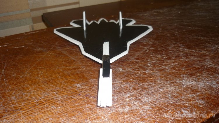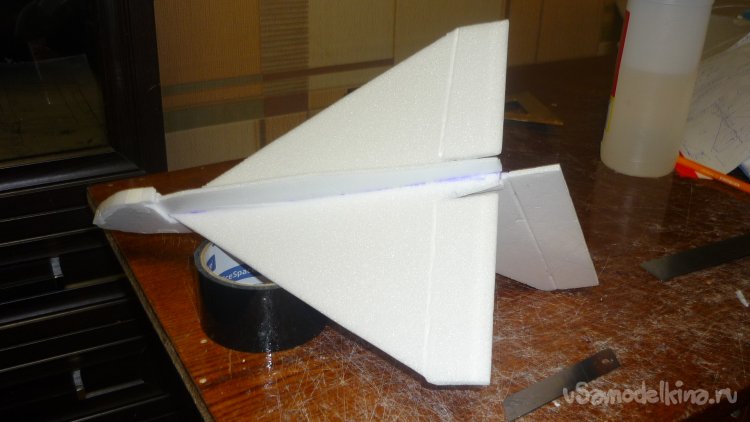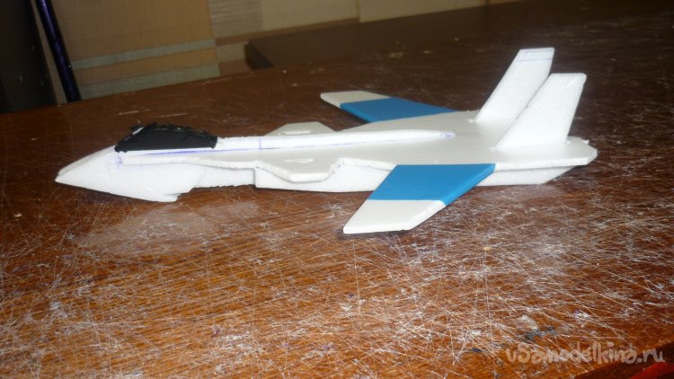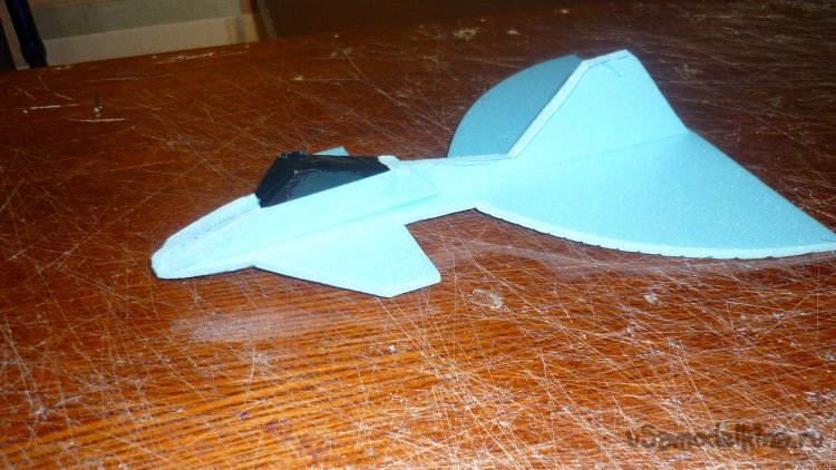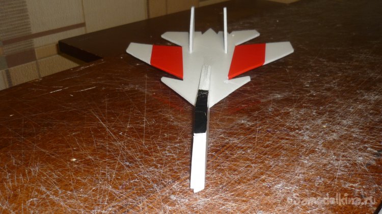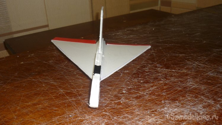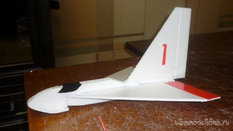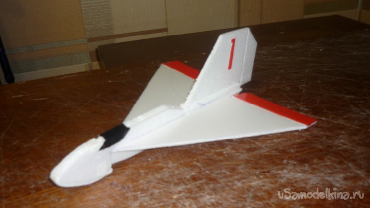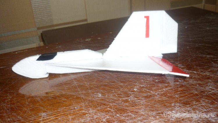 Обозначил кабину чёрным скотчем и обтянул элевоны красным скотчем, на киле поставил цифру 1.