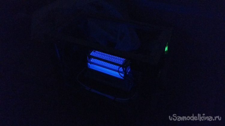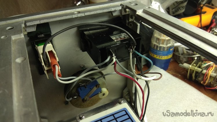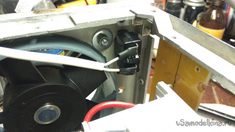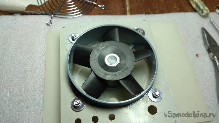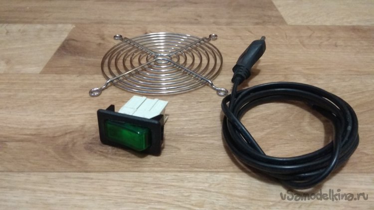 Выключатель с неоновой индикацией, шнур от предыдущего проекта с колонками. Решетку на вентилятор я так и не использовал. Ее оказалось неудобно крепить, да и надобности в ней сильно нет.
