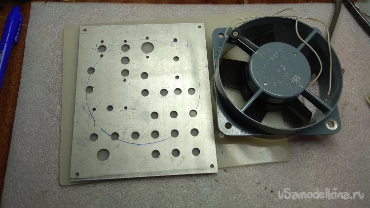 Отверстий на панели много, для передней панели она уже не годится, но для установки вентилятора на задней панели как раз. Приложив вентилятор, размечаю на панели будущее отверстие.