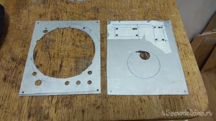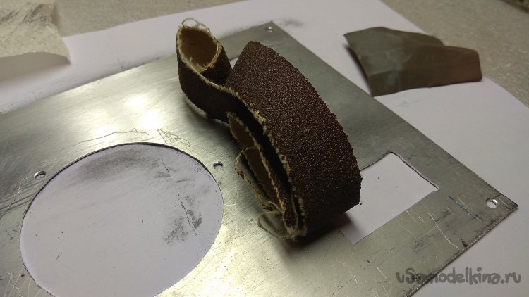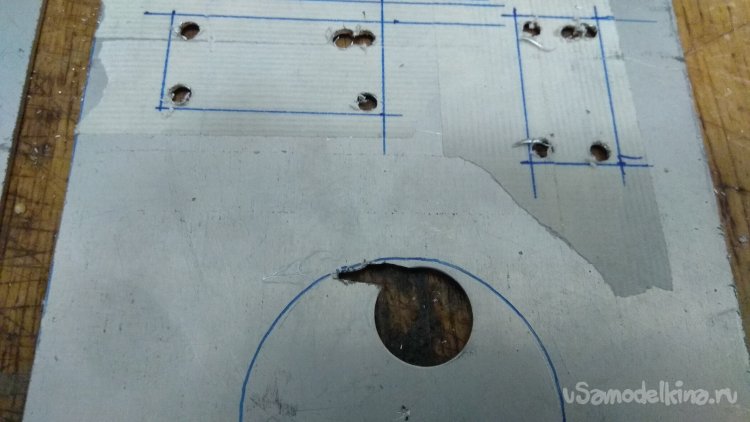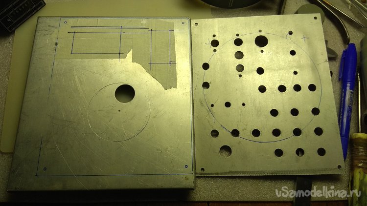 Для передней панели нашел кусок тонкого листового алюминия. Наклеив малярный скотч, размечаю места отверстий для компонентов передней панели.