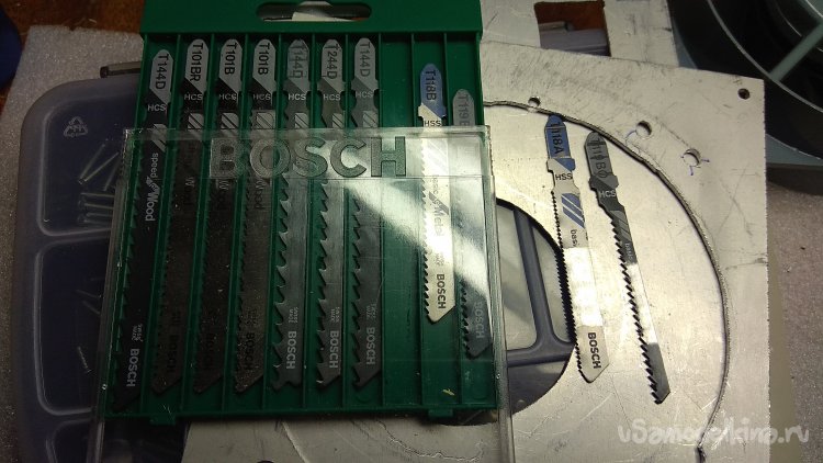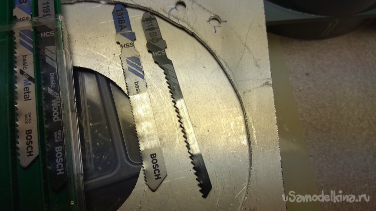 С пилками для лобзика небольшая загвоздка. По металлу, с маркировкой HSS, имеется только широкая пилка. Узкая пилка у меня одна и то с маркировкой HCS для мягких материалов типа древесины и ее производных, пластика и т.д..