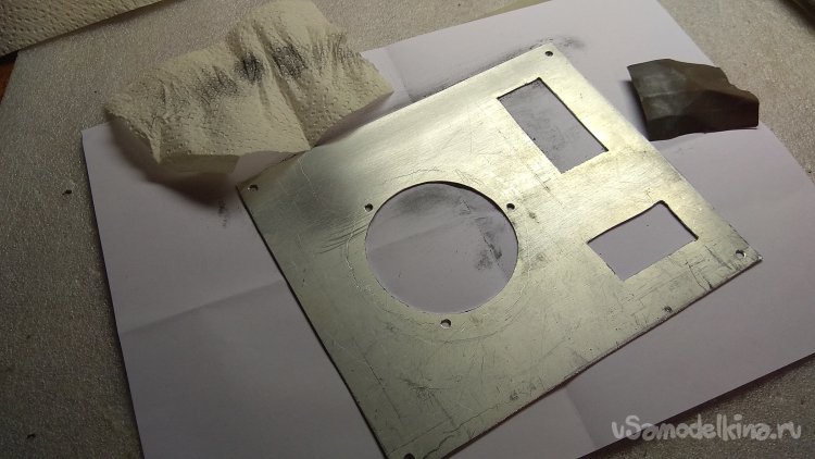Не унываем, берем сразу крупную наждачку, будем создавать крупную риску. На тыльной стороне попробовал делать продольную риску и круговую. Продольная риска понравилась больше. Прошел наждачкой по обеим панелям.