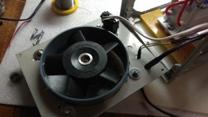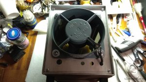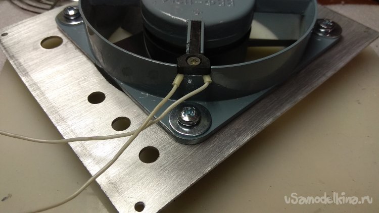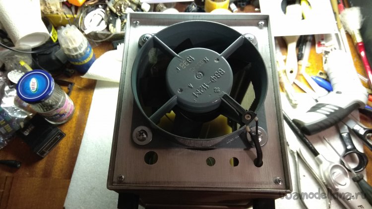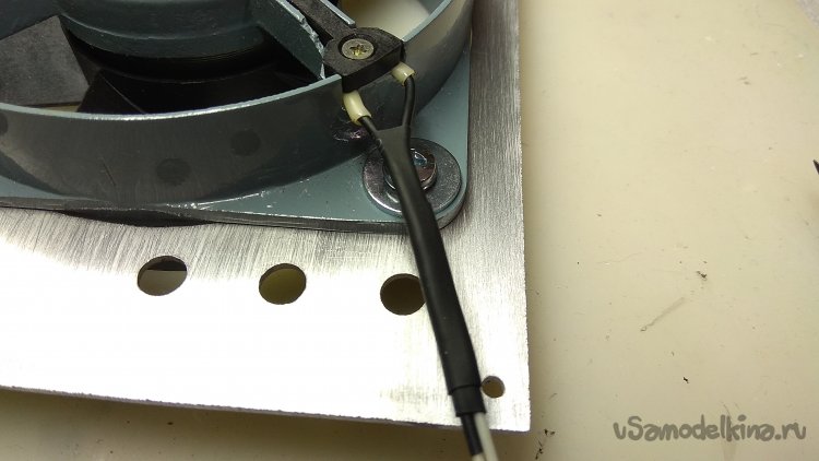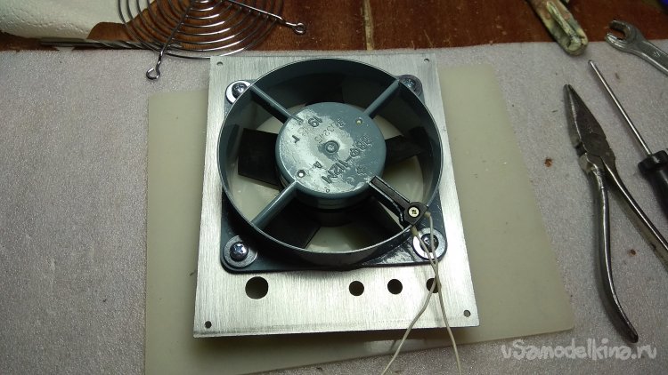 Устанавливаем на заднюю стенку вентилятор. Пару отверстий для крепления совпало, просверлил недостающие отверстия. Чтобы скрыть неровность отверстия вентилятор крепим снаружи, располагая его на выдув.