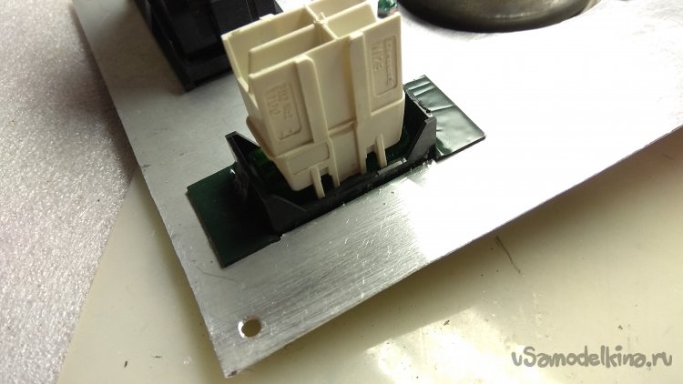 Выключатель немного болтается в отверстии по вертикали. Пластина тонкая, выключатель был рассчитан под более толстую панель. Поставил проставки из вспененного материала под крепежные лепестки выключателя, дополнительно проклеил выключатель по бокам клеем Е8000.
