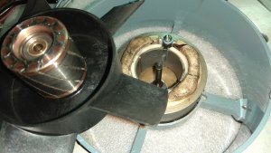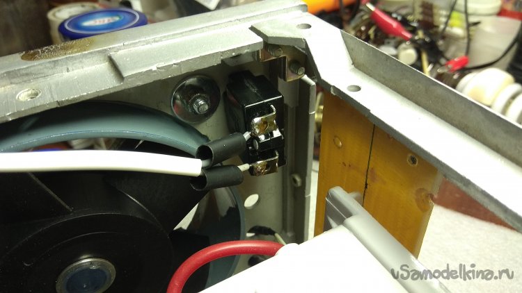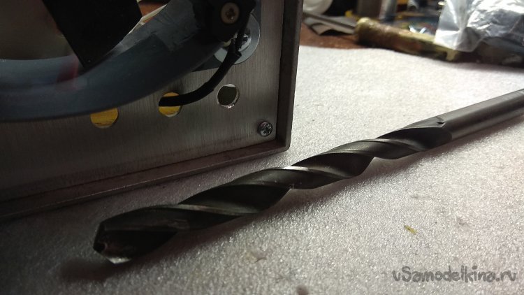 Займемся сетевым шнуром. Провод вентилятора был перемещен в соседнее отверстие, крайнее отверстие я прозенковал большим сверлом с двух сторон, чтобы не резалась сделанная термоусадкой защитная изоляция кабеля.