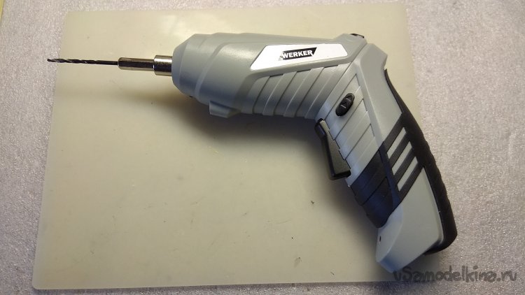 Займемся установкой пластин стеклотекстолита. Надо просверлить отверстия. Только вот небольшое неудобство, шуруповерт, которым я обычно работаю, попросил попользоваться коллега. Дрелью пользуюсь мало, поэтому она хранится в шкафу, в родном чемодане. Не так давно было обсуждение шуруповерта-отвертки, о которой я недавно рассказывал. Так вот, в комплекте шуруповерта имеется как раз нужное мне сверло 2,5мм. Просверлю отверстие электроотверткой, винт сам нарежет резьбу в стеклотекстолите. Хороший тест для инструмента.