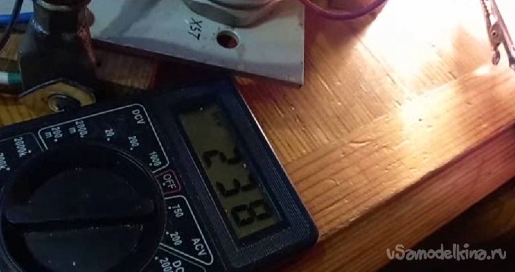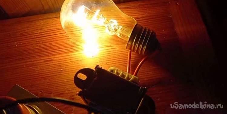 В качестве нагрузки решил взять лампу не светодиодную, а накаливания шестьдесят ватт, все спаяв, подключил к аккумулятору. Лампа вспыхнула ярко, Замерил полученное напряжение, оно оказалось 238 вольт.