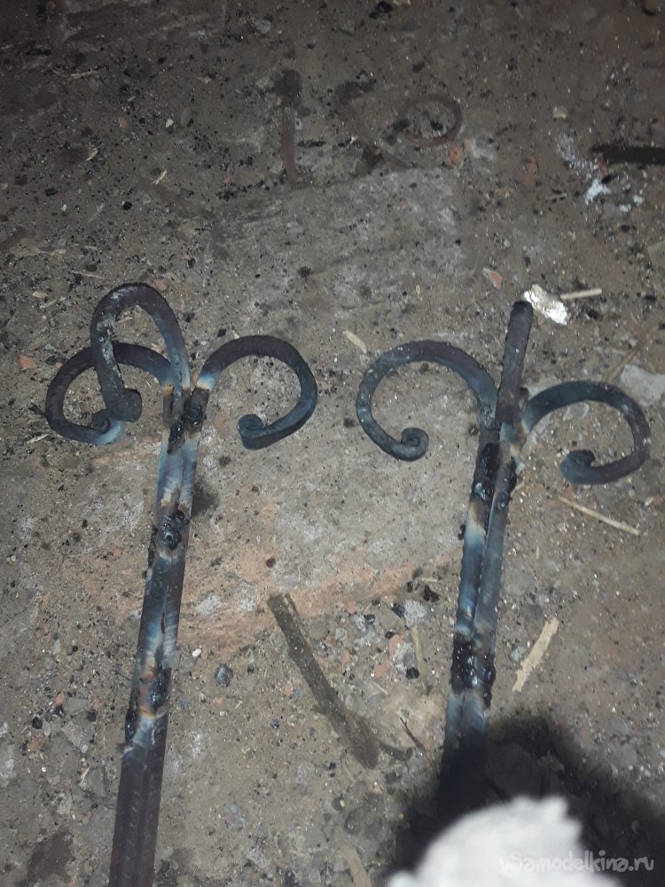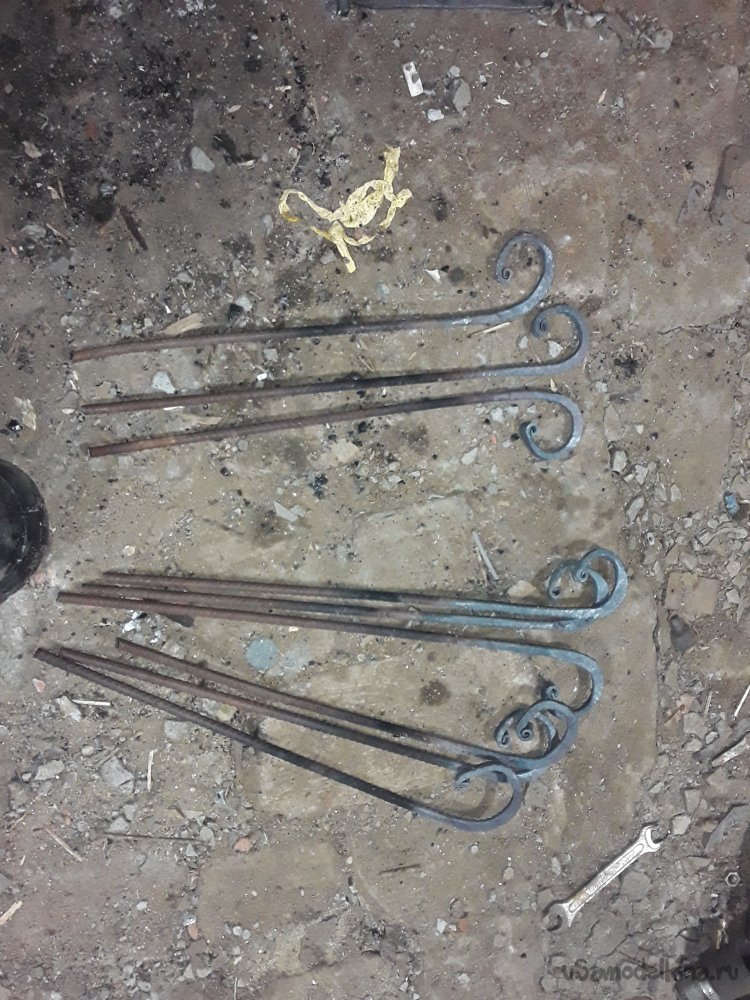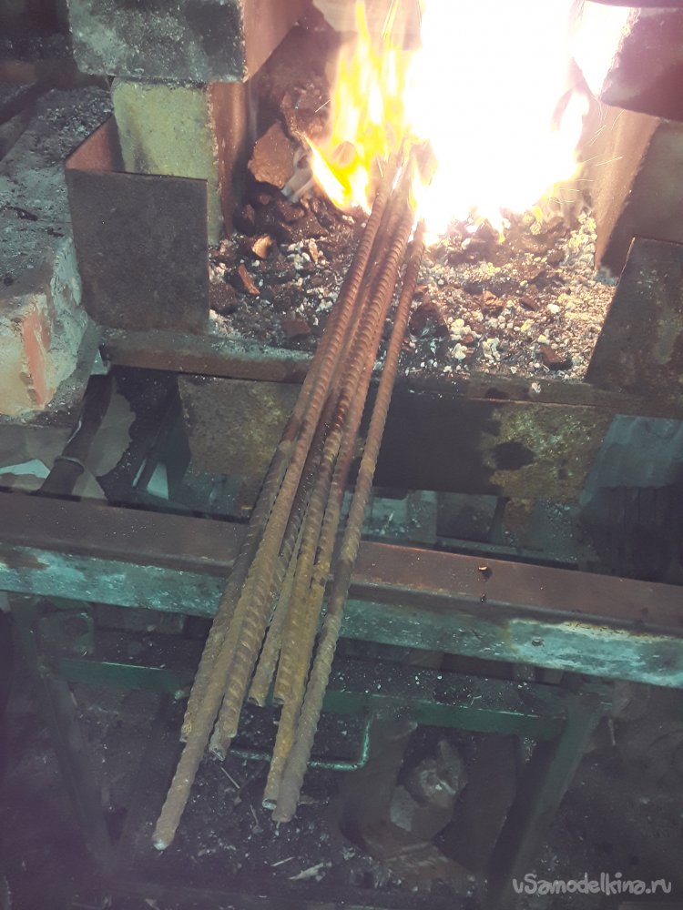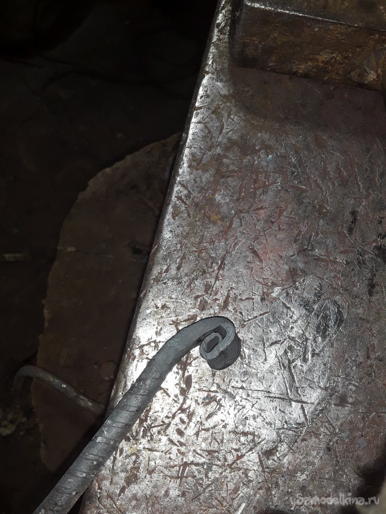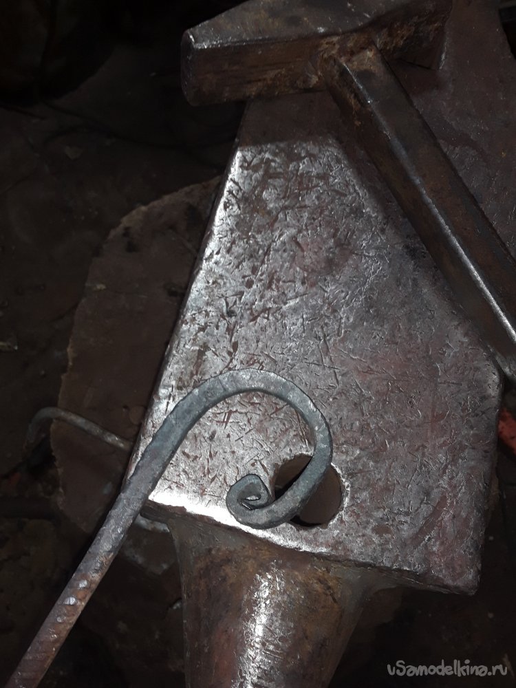 Для удержания ствола отрезал трубу 50мм длинной 15см почистил до блеска и обжег в горне. Для удержания ели решил собрать крестовину 3‑х ногую для них нарезал по 3 куска 50см арматуры в общем 9 кусков. Нагреваю все сразу в горне и по очереди по 10см от края формирую квадрат, а край 3 см заостряю пикой и расплющиваю до толщены 1мм. Ширина этого места получилась 2см, а длина 3см далее произвожу нагрев и молотком закручиваю рулетом на 3 оборота, а потом немного ударами по торцу подравниваю чтобы метал стал на вид толще. Еще раз нагреваю и на роге наковальни загибаю кольцом, но не до конца так, чтобы место скрутки смотрело внутрь и не доходило 4см до основного прута. Радиус загиба получился примерно 40мм. Потом отступаю от рулона 3см и на краю наковальни положив на бок прут немного сплющиваю бок где-то 7см до толщены 2мм так красивее и ножки станут прочнее и можно будет не бояться поломки.