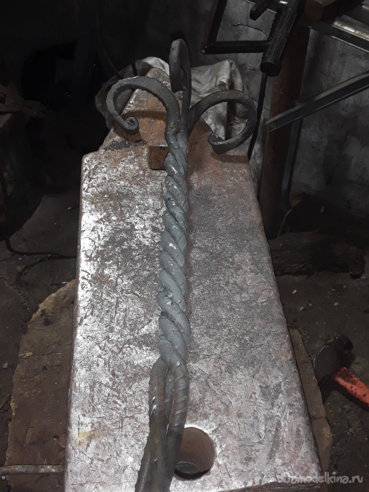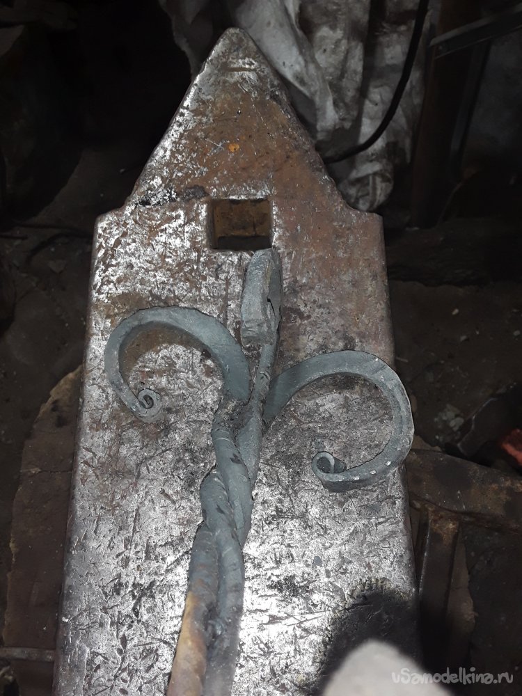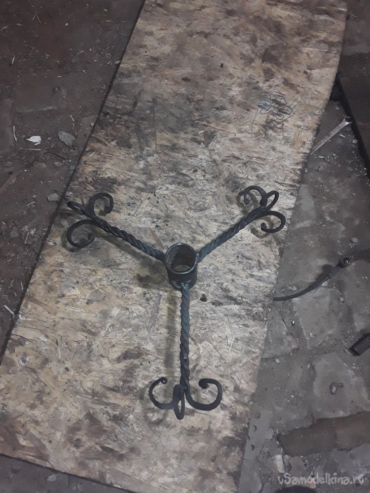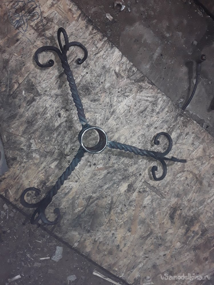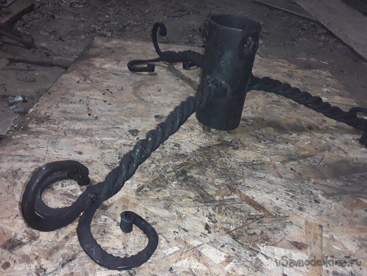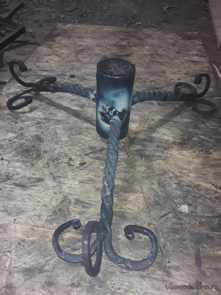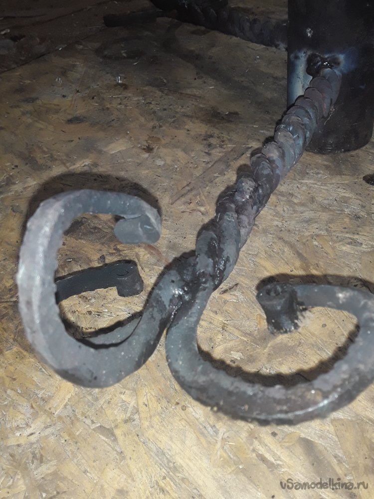 Дальше думал и ничего лучше не придумал как просто скрутить ножки торсионном. Для скрутки сделал приспособление на скорую руку, а это взял полосу 8мм длиной 5см и сделал пропил шириной 10мм, а длиной 3см потом сверху над прорезью приварил кусок арматуры. И это все зажал в тиски удержание буду делать газовым ключом. Сначала загрузил в горн все 3 ножки они долго грелись, а когда одна нагрелась как нужно начал вытаскивать у меня все запуталось и мне пришлось нагревать по одной. Нагрев произвожу от начала, где расплющил участок 10см потом вставляю в приспособление и закручиваю пока хватает сил. Далее все скручиваю так же потом снова грею и закручиваю остальное. Участок закрученный получился 25 см когда производил работы центральный прут выгнулся в бок. После скрутки на углу наковальни подогнул все под прямым углом чтобы все было красиво. И так все 3 ножки скрутил и подравнял. Места сварки остались между скруткой и их совсем не видно.