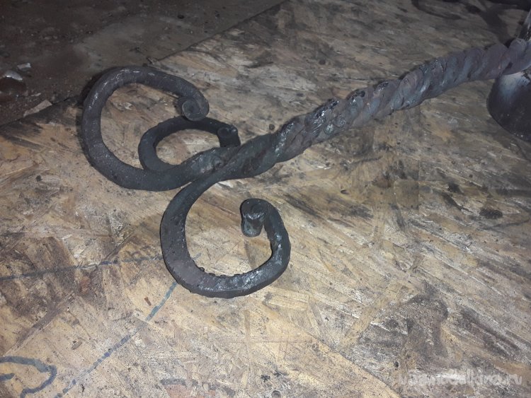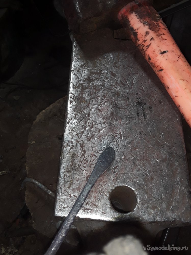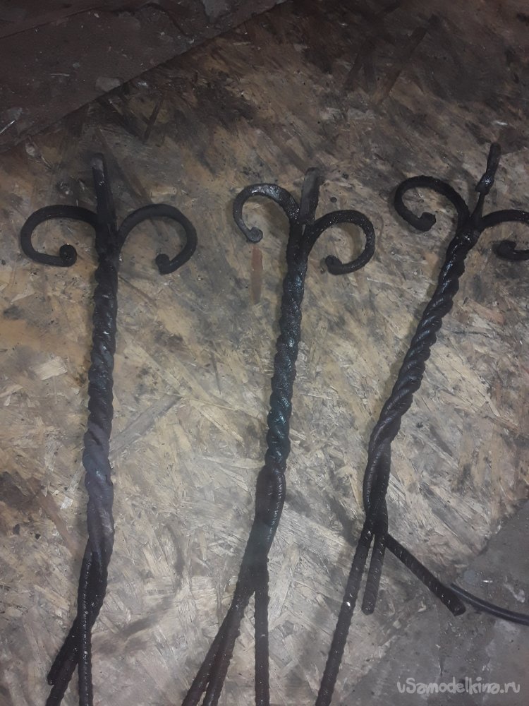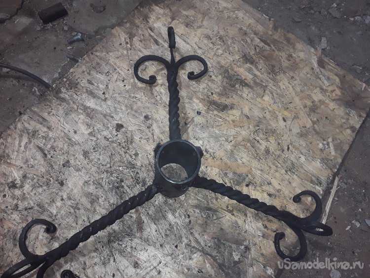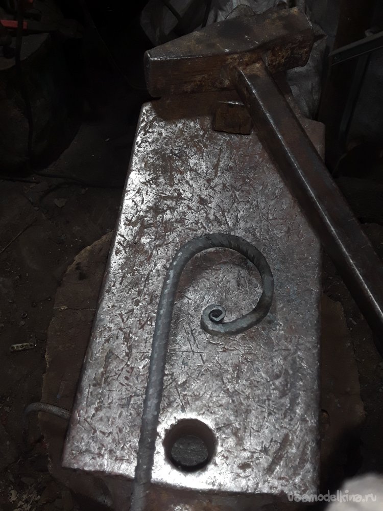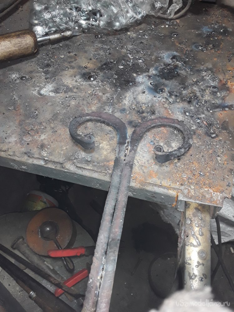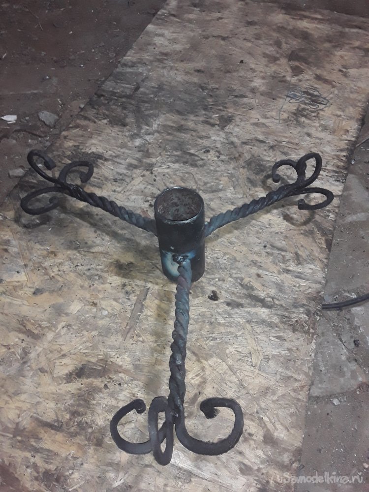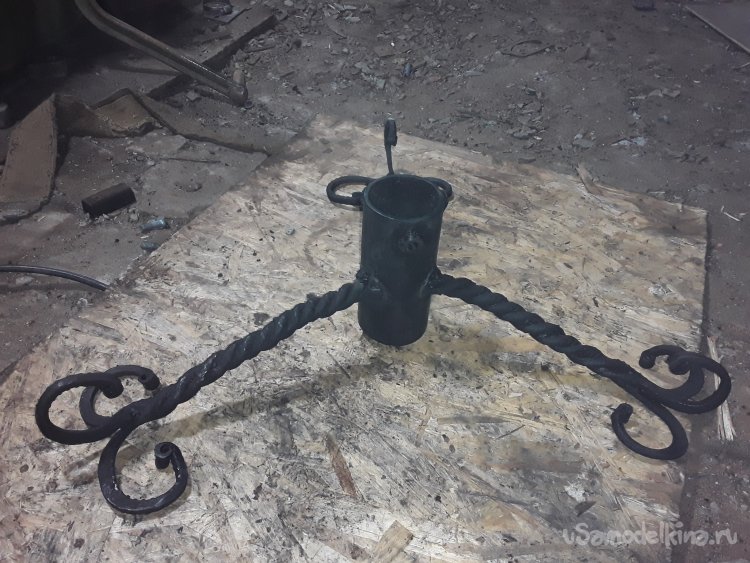 Дальше думал и ничего лучше не придумал как просто скрутить ножки торсионном. Для скрутки сделал приспособление на скорую руку, а это взял полосу 8мм длиной 5см и сделал пропил шириной 10мм, а длиной 3см потом сверху над прорезью приварил кусок арматуры. И это все зажал в тиски удержание буду делать газовым ключом. Сначала загрузил в горн все 3 ножки они долго грелись, а когда одна нагрелась как нужно начал вытаскивать у меня все запуталось и мне пришлось нагревать по одной. Нагрев произвожу от начала, где расплющил участок 10см потом вставляю в приспособление и закручиваю пока хватает сил. Далее все скручиваю так же потом снова грею и закручиваю остальное. Участок закрученный получился 25 см когда производил работы центральный прут выгнулся в бок. После скрутки на углу наковальни подогнул все под прямым углом чтобы все было красиво. И так все 3 ножки скрутил и подравнял. Места сварки остались между скруткой и их совсем не видно.