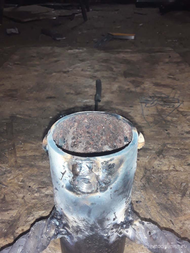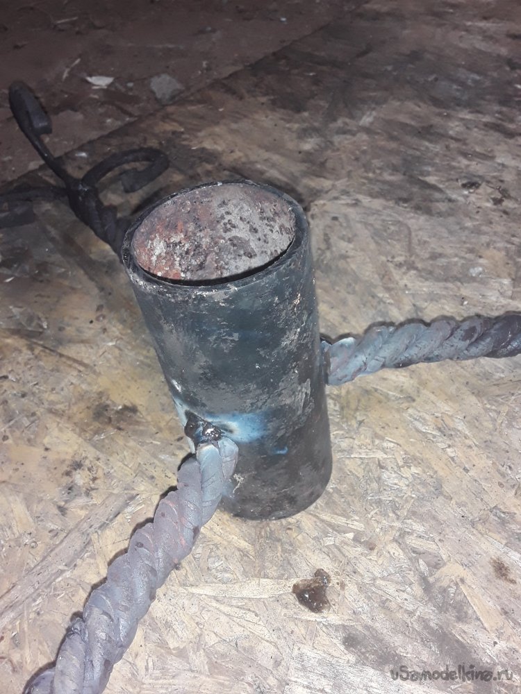 Далее отмерил самую короткую, а это 25 см и по ней отрезал все три ножки болгаркой все скручено плотно и ничего не разваливается. Теперь на трубе сделал разметку отступив от края 4см по кругу начертил линию потом, поделил на 3 равные части это самое важное от этого зависит устойчивость елки. Далее имея отметки привариваю все ножки на свои места ровно по линии привариваю только после того как проверил все на ровность. Трубу приварил так, чтобы можно было ставить емкость с водой так елка простоит дольше. Теперь ножки нужно согнуть одинаково для этого отрезаю кусок арматуры и привариваю его к столу потом сверху привариваю трубу так, чтобы край трубы был в 2‑х см от поверхности стола. На прихватках все держится хорошо теперь горелкой нагреваю от трубы участок 10см и загибаю ножку вплотную к столу и подгибаю загибы вплотную к столу, а центральный загиб подбиваю вниз. Все это повторяю со всеми тремя ножками потом отрезаю трубу от стола ставлю на пол. С помощью угольника проверяю чтобы все было под прямым углом. Везде где не ровно подбиваю молотком. Для крепления самой елки делаю разметку на трубе 2см от края и на равном расстояние просверливаю 3 отверстия на 8мм. Закручиваю гайку м6 на болт центрую в отверстие и привариваю к трубе. Перед воронением болгаркой шлифую все швы сварки потом с щеткой по металлу зачищаю до блеска весь метал чтобы слой, лег ровно и потом ничего не отслаивалось.