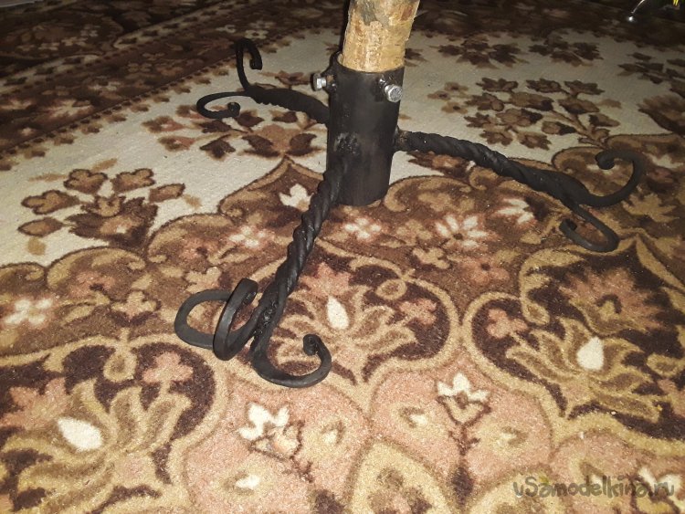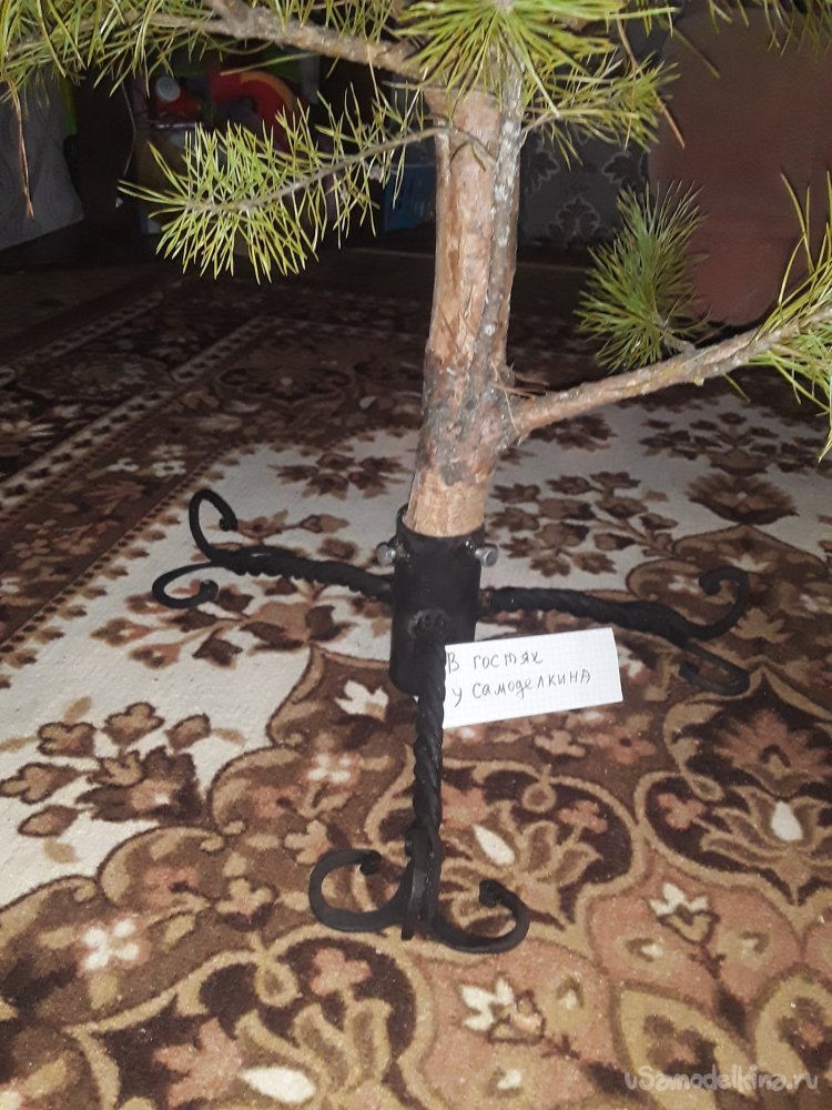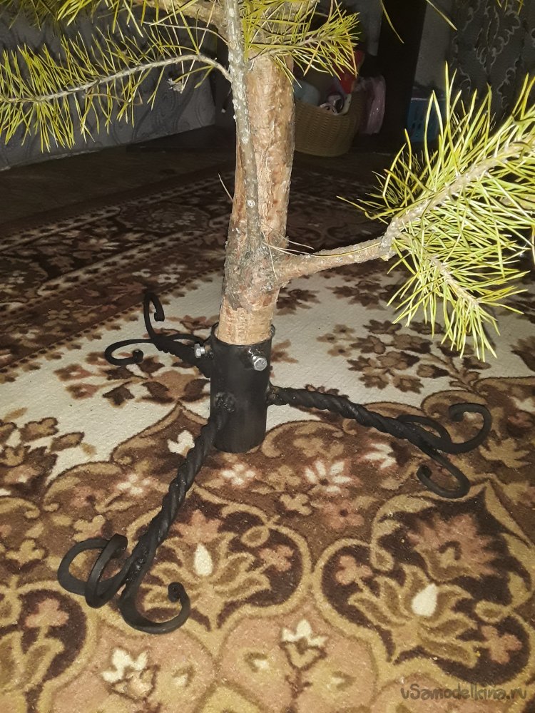 Вот и все зря боялся, но подставка получилась крепкой и красивой, а самое главное своими руками. На все работы у меня ушло 4 часа думаю большую часть ушло на рассуждения. Подставка простая в изготовлении главное желание конечно можно было сделать и лучше, но это уже в следующий раз. Дал остыть металлу потом закрутил 3 болта и пошел домой. Всем понравилось и было решено установить елку сразу, а это час ночи. Так как ствол у основания елка немного кривая, а диаметр как раз под трубу и чтобы все было ровно ножом немного обстрогал в том месте, где искривление и закрутил болты как можно плотно. Вот и все готово можно наряжать. Подставка вполне хорошо держит 2‑х метровою елку и внешний вид в общем ничего. Пока я умылся и покушал мои близкие дружно все нарядили все счастливые, а это самое главное для меня нужно ценить то что у нас есть. Моя статья подошла к концу все что делал, и знаю я показал и рассказал если есть вопросы или предложения пишите комментарии буду очень рад и критики и предложений. С наступающим вас и ваших близкий и желаю очень много здоровья вашим детям, вам и столько же денег и пусть в вашем доме будет всегда мир и согласия. До новых самоделок!!