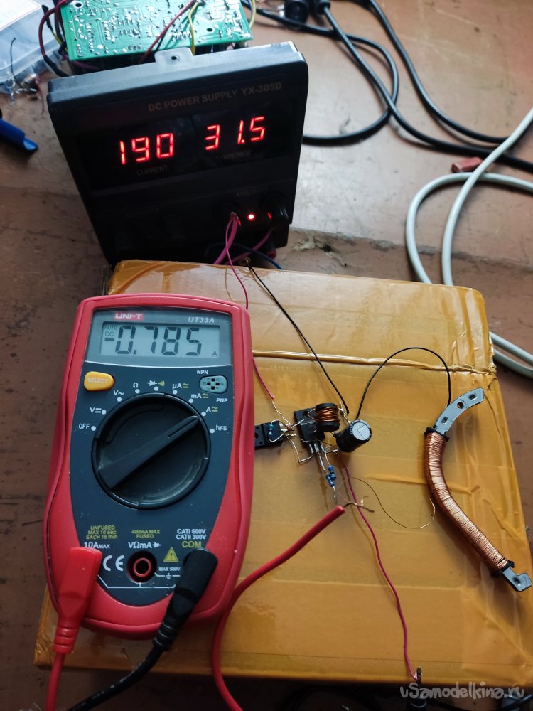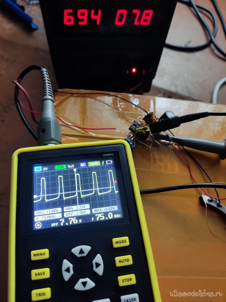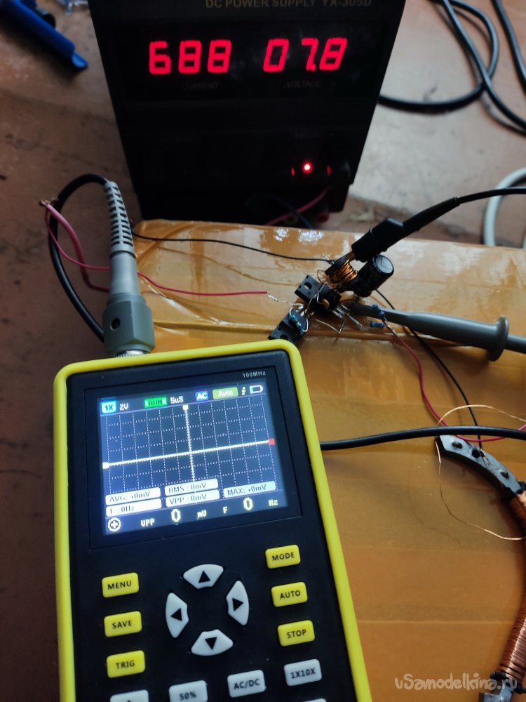 Всё собрано и готово к работе, так давайте уже подключим питание и запустим это импульсный преобразователь, питать я буду от лабораторного источника питания, выставил напряжение на максимум и подключаем