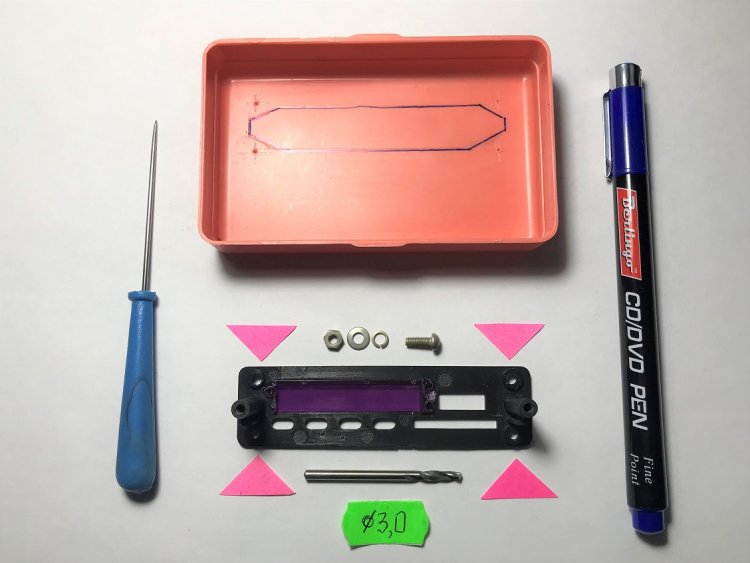 Корпусом для ПДФ будет «традиционная» мыльница прямоугольной формы размерами 100х60х32 мм. В чёрной пластмассовой фальшпанели 4 отверстия под винты М2,5 рассверливаем сверлом диаметром 3 мм, под более распространённые винты М3х10мм. Автор решил проделать паз в крышке корпуса под модуль жалом нагретого паяльника мощностью 25 Ватт. Метод быстрый, тихий, с небольшим запахом плавящейся пластмассы, но не очень аккуратный. Жало паяльника пришлось несколько минут очищать от расплавленной пластмассы, а оплавленные края мыльницы обкусывать торцевыми кусачками. Чистовую обработку внутренних кромок паза всё равно пришлось выполнять напильником.