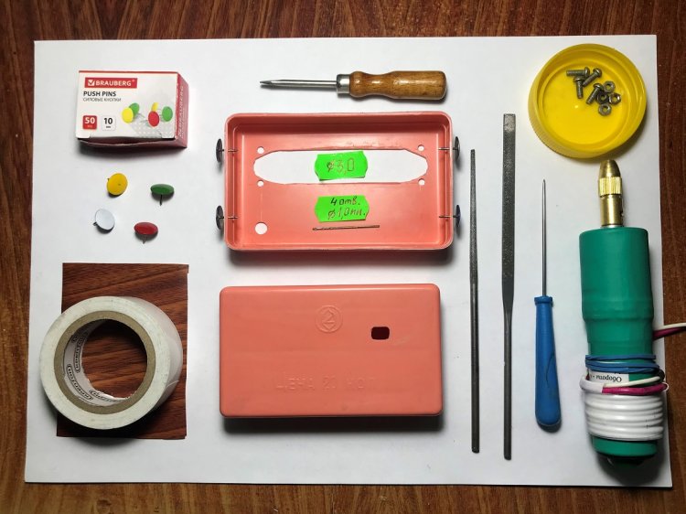 Силовые кнопки будут соединять обе половинки корпуса-мыльницы по окончании сборки корпуса. Чтобы силовые кнопки (с диаметром острия 1,1 мм) в корпусе держались прочно, отверстия делаем сверлом диаметром на 0,1 мм меньшим, чем диаметр острия кнопок.