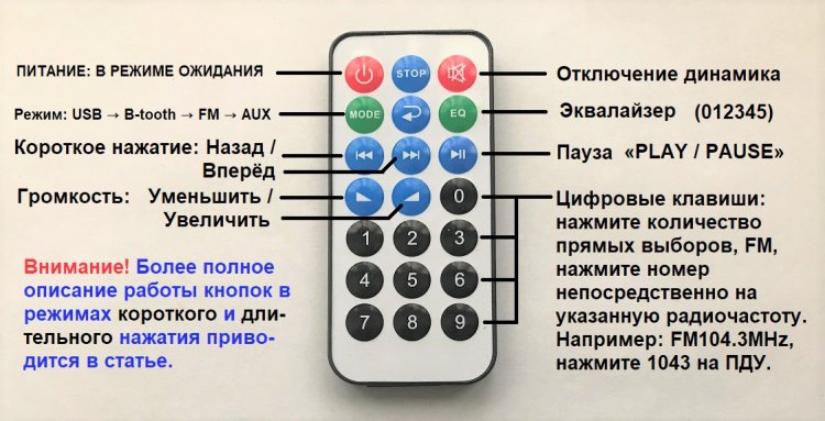 После нажатия кнопки «STOP» музыку с флешки можно вызывать, набрав порядковый номер трека. При этом кнопки «Вперёд» и «Назад», кнопки изменения громкости не работают. При кратком нажатии на кнопку «Play / Pause» начинается воспроизведение трека №1. Далее кнопка «Play / Pause» снова продолжает выполнять только функцию «Пауза».