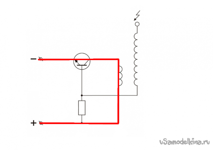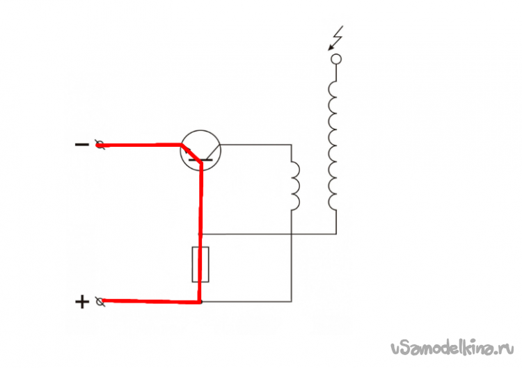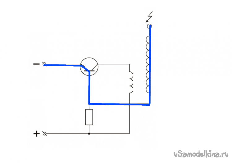 После этого во вторичной катушке наводится ток, а полярность меняется и на базу транзистора идёт отрицательный импульс, транзистор закрывается, Из-за этого и может не работать качер, потому что если неправильно подключить первичную катушку то транзистор будет всё время открыт