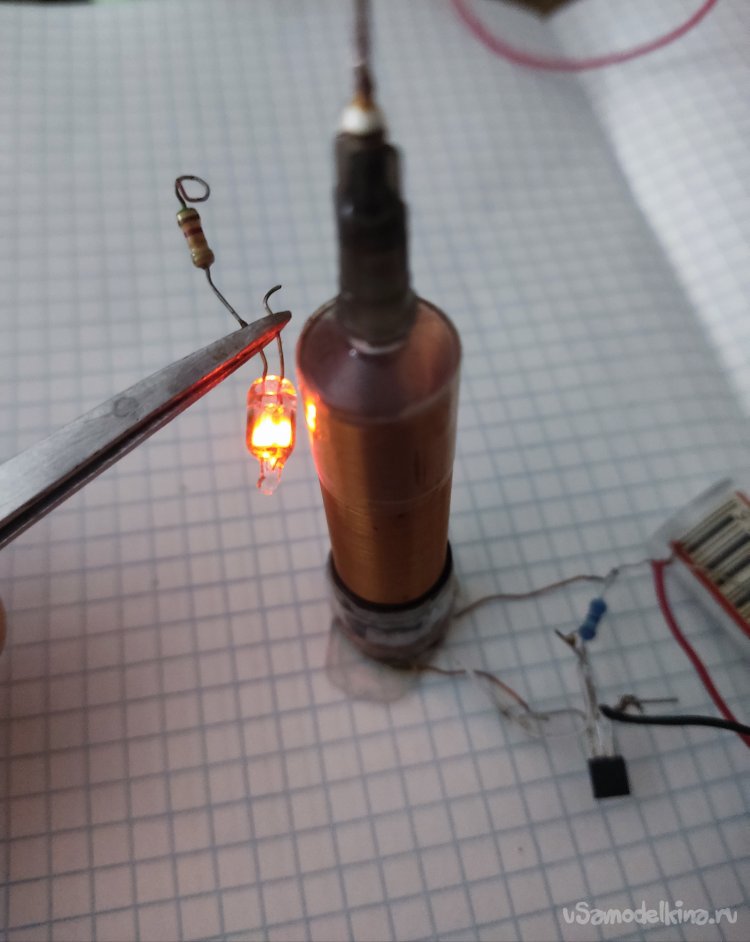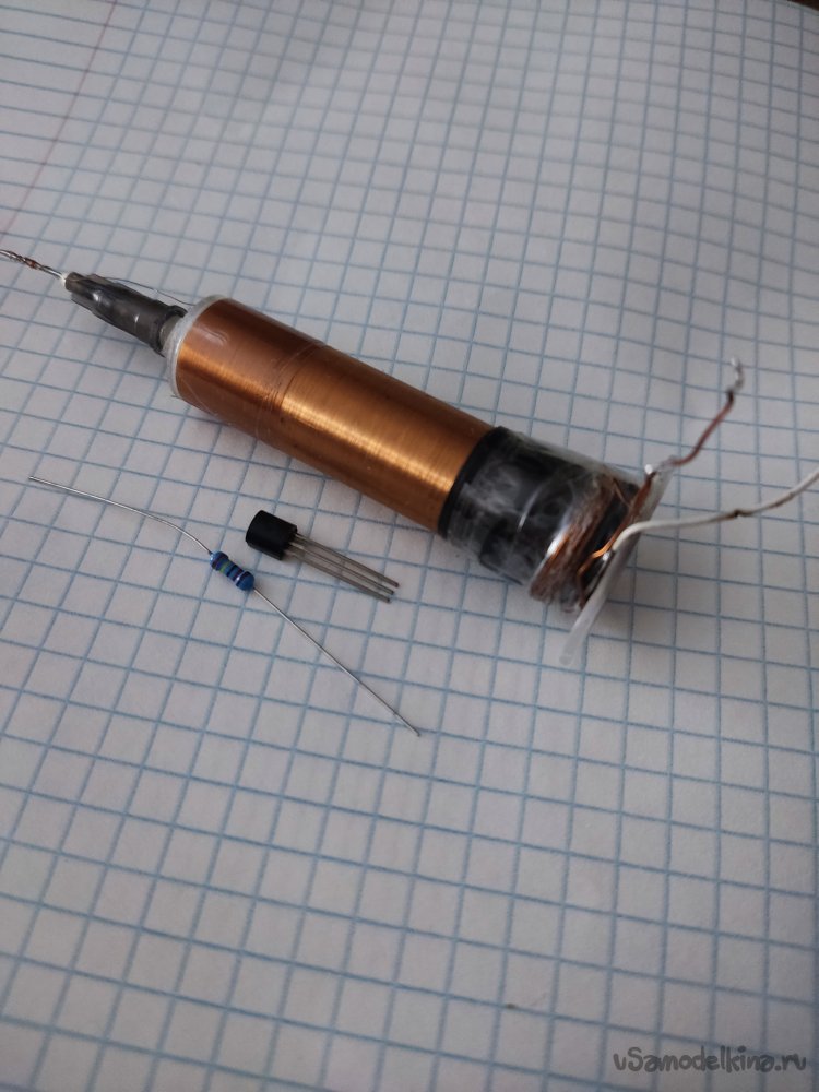 Самое сложное это катушка, я намотал несколько сотен витков тонким проводом от реле, мотал на шприц, он для этого отлично подходит, чем больше витков намотаете тем выше выходное напряжение