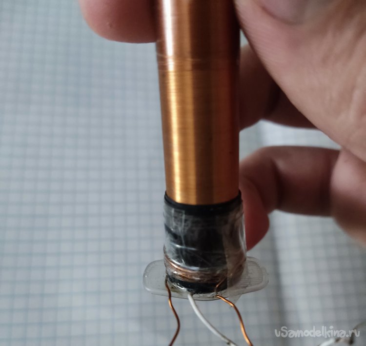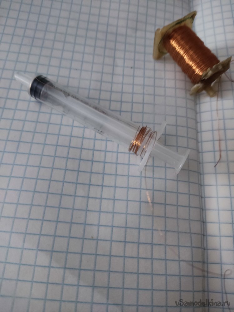 Мотать следует аккуратно, виток к витку без нахлестов, очень полезно закрепить провод внутри шприца. После намотки обрезаем провод и чтобы катушка не отматывалась фиксируем начало и конец скотчем или изолентой (советую взять синюю)