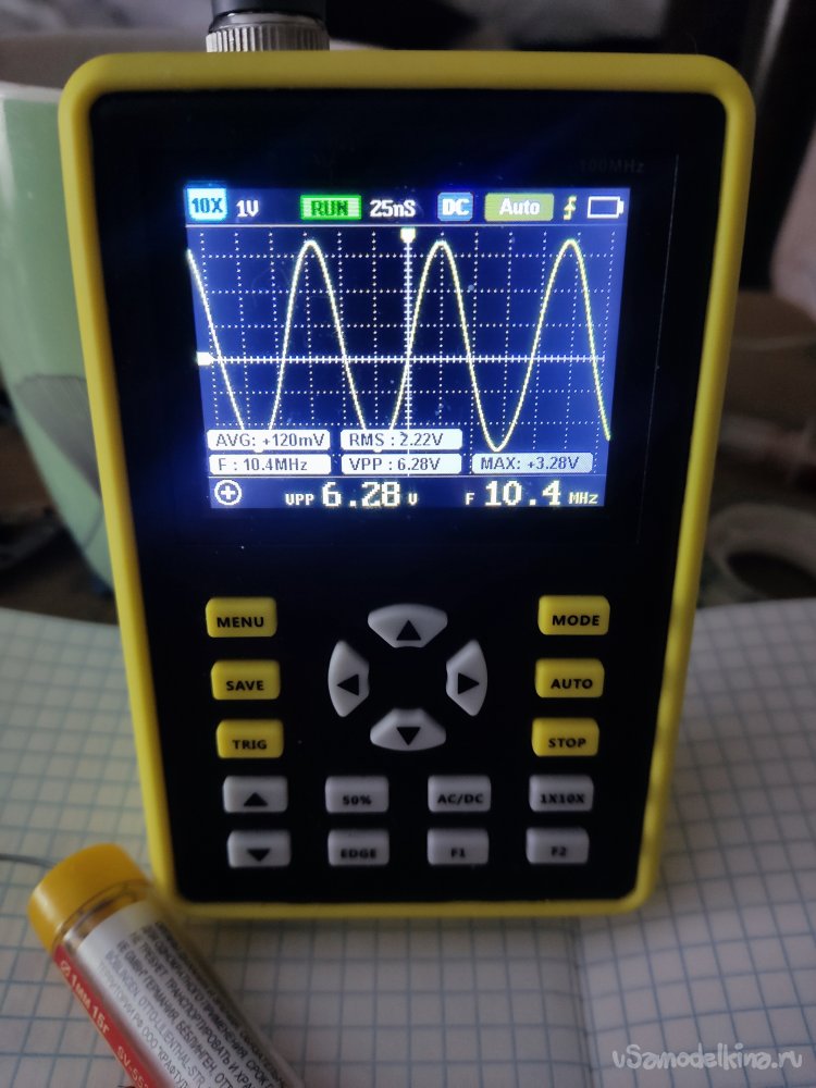 Мы видим синусоиду с высокой частотой 10 МГц, как мы уже говорили, она зависит от количества витков в первичной катушке
