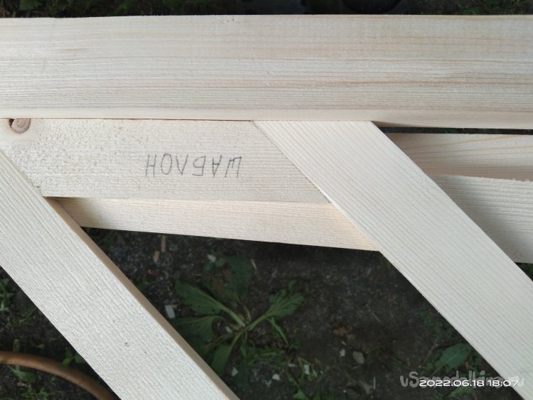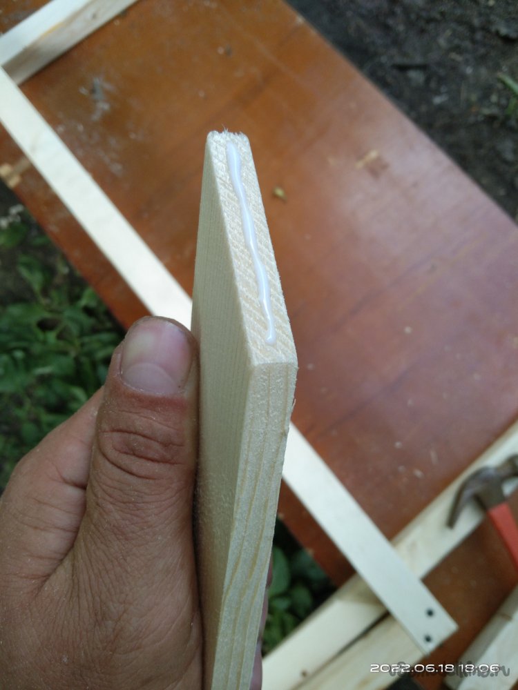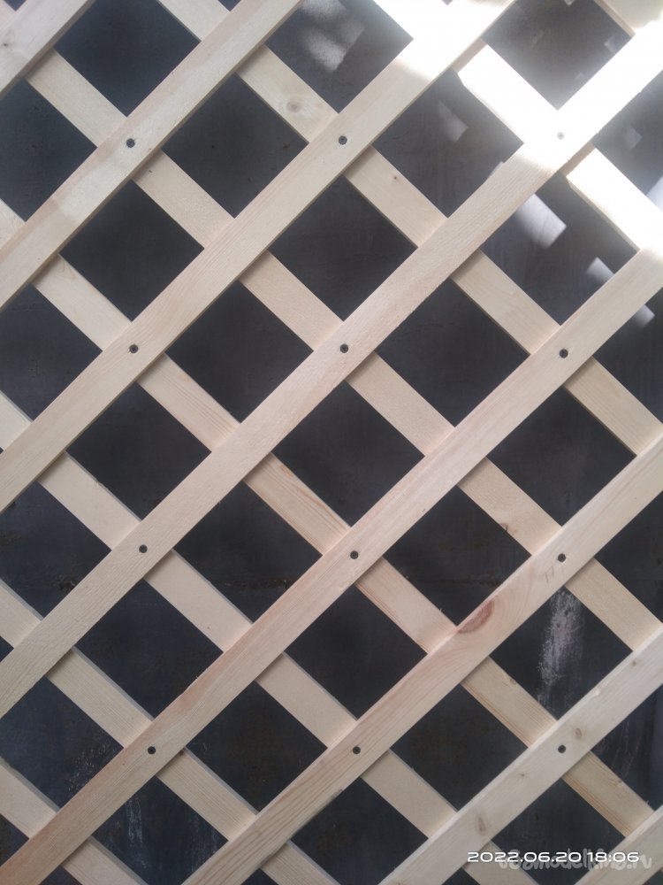 Приступаю к изготовлению и сборке диагональных реек. Беру необходимую по размеру, примерно, рейку и прикладываю ее к основе. Отмечаю места среза ненужных частей. Сборку начинал с углов основы. Для этого первую рейку с одного конца обрез с двух сторон, чтобы она полностью совпала с углом основы. Нанес клей на место спила и прибил рейку гвоздями к брускам 40*40 мм. Заказчик попросил сделать зазор между диагональными рейками определенного размера. Поэтому я для удобства и быстроты сборки изготовил себе шаблон, прикладывая который я легко и быстро получал нужный мне пробел между диагональными рейками. Таким образом собрал все секции обрешетки. Пересечения диагональных планок я зафиксировал саморезами. В конце все тщательно шлифуется, во избежание попадания заноз.